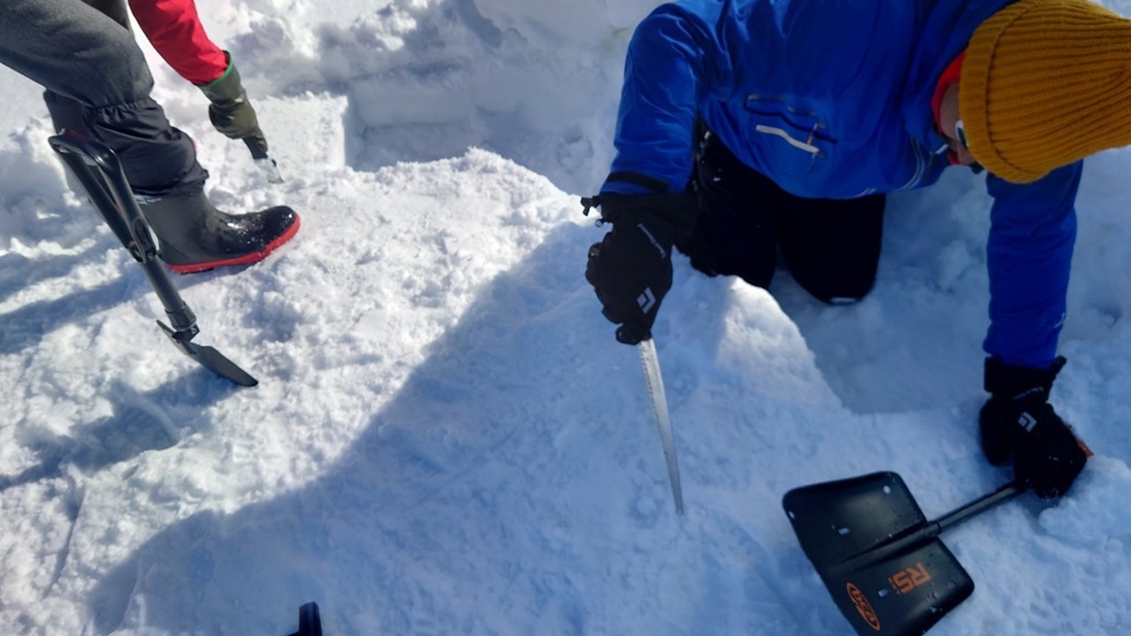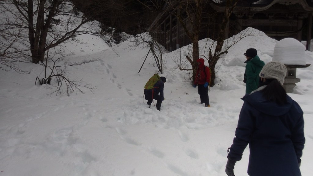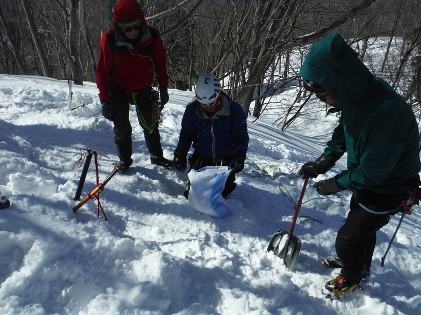 (木村)諸般の事情により、出発が遅れ一王子神社に14:30着でした。既にイグルーが完成しており、夕食からの参加となりました。避難小屋で鍋を囲み同じ釜の飯を分け合い歓談し楽しい時間を過ごしました。食事を準備して頂いた宮崎さんと奥様に感謝です。ビバーク体験は、持参したテントで一夜を明かしました。二日目のビーコン捜索は、二王子神社周辺で行われました。時間に差はあれど、3点セットを持っていれば確実に掘り当てることが出来ました。改めてアバランチギアの大切さを痛感しました。トレーニング下での埋没条件であれば、半日程度の訓練で生存ラインの15分をクリア出来るようになると思います。埋没体験では、圧迫感、閉塞感に襲われ、短時間でしたが死を覚悟するほどの絶望的な経験となりました。今回は、埋まってからの訓練でしたが、ピットテスト等、埋まらない予防措置の訓練もしておくべきだと思いました。実質、二日目からの参加でしたが良い経験が出来ました。身に付くよう定期的に訓練を行うことが必要だなと感じました。訓練の計画と準備をして頂いた山宮会長、佐藤くんに改めて感謝します。来年も参加しますのでアプローチの近い場所が良いです。(移動の時間も訓練に割けられるので)