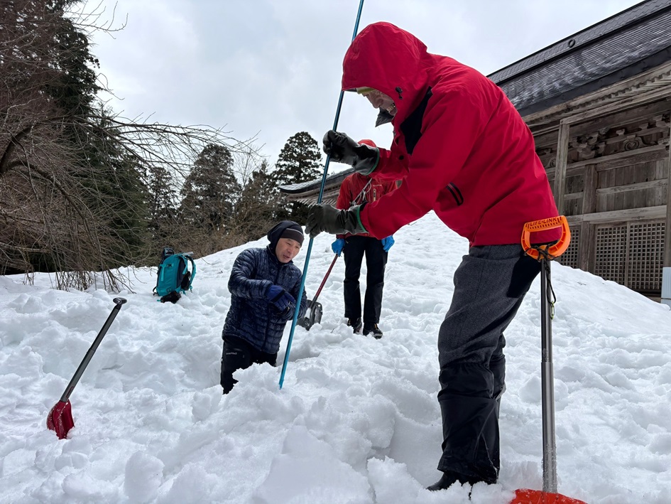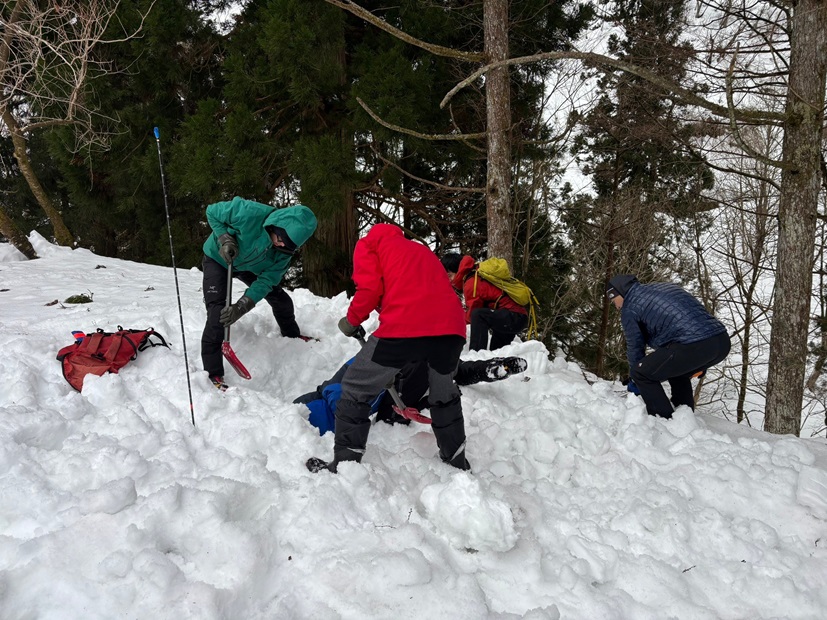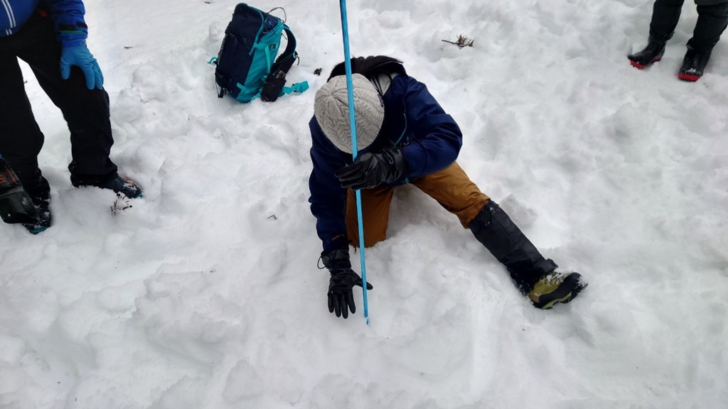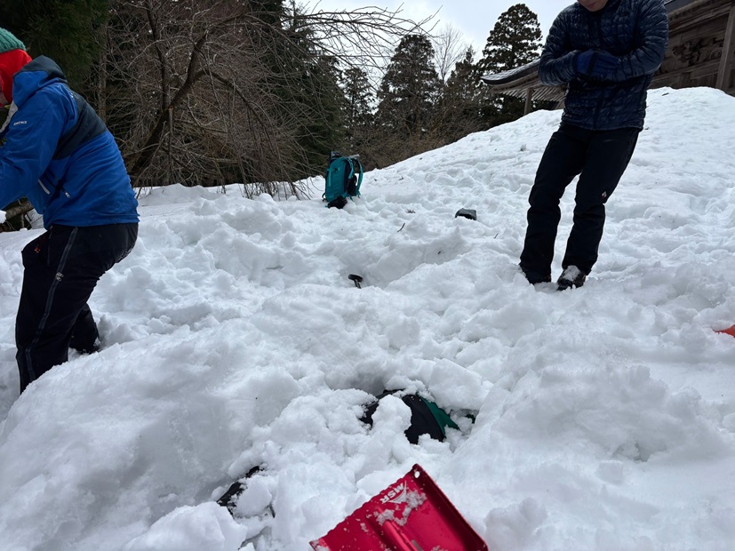 (神蔵)2日目のビーコン訓練に参加しました。佐藤さんから説明を受けた後ひとりひとりが実践。ビーコンを使って全員が目標に辿り着けました。実際の現場では人命がかかっているのでよりスピーディに、でも雑にならないよう丁寧確実な作業をしなければと痛感しました。どんなに優れた装置もいざという時に使いこなせなければ意味がないので定期的に練習して対応できるよう備えたいです。埋没体験は少し雪を被っただけで動けず、胸を圧迫されて呼吸が苦しく全身が埋まる前にギブアップ。雪崩に巻き込まれるような事にはなりたくないと強く感じました。少しずつ経験を積み安全に雪山を楽しむ為のスキルを磨いていきたいです。