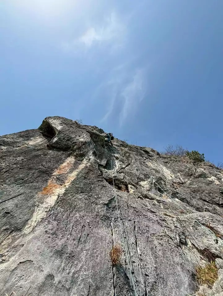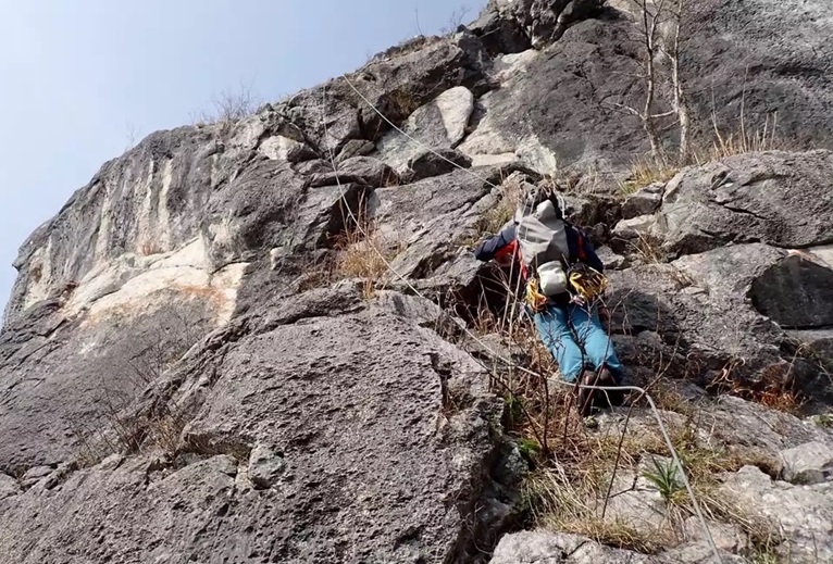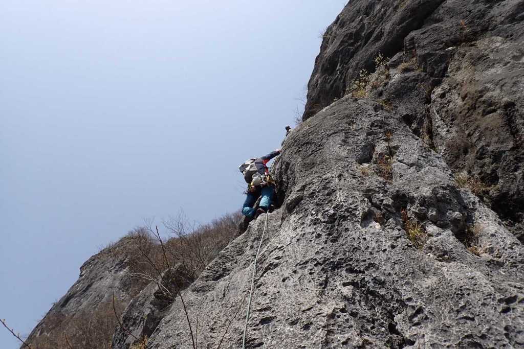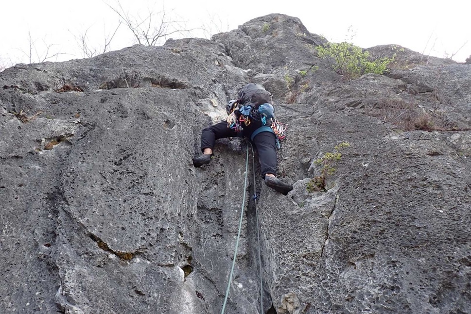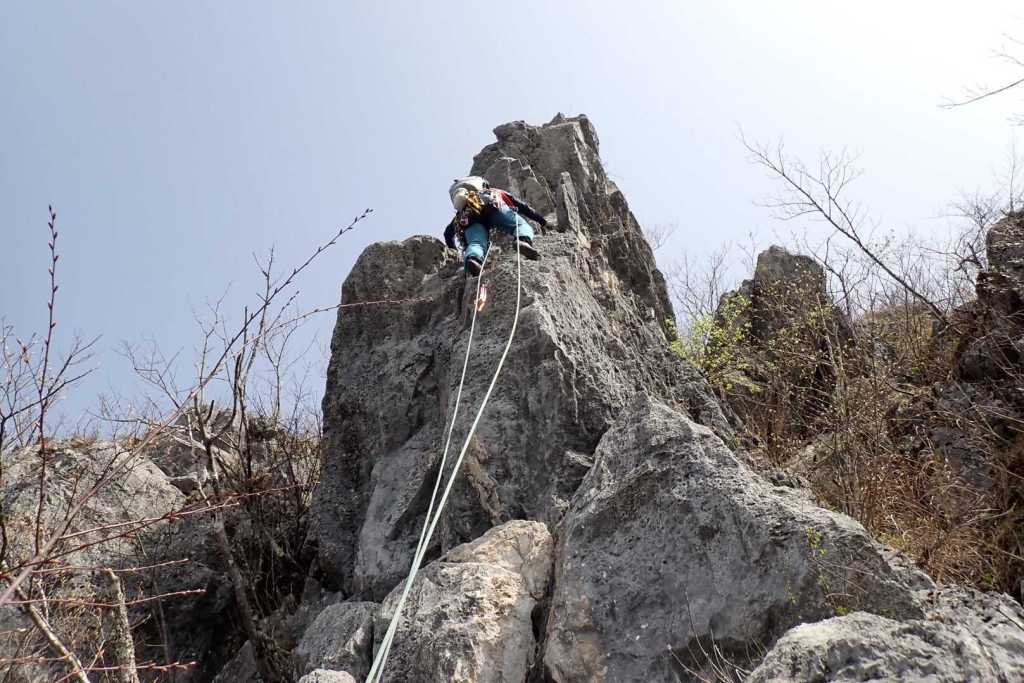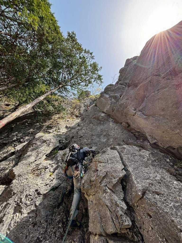 【中央陵】最高グレードは5.9 (6ピッチ)ピッチ数: 5~6ピッチ。石灰岩特有の様々な形状のホールドがあり、テクニックを駆使して登る楽しさがあります。全体的にグレードは高くなく、10a程度のクライミングができる方であれば楽しめるでしょう。各ピッチの終了点には広いテラスがあることが多く、ビレイや休憩がしやすいです。マルチピッチのシステムを学ぶのにも適しています。6ピッチを登りきると、高度感と達成感を味わえます。基本的にはボルトが設置されていますが、一部カムなどのナチュラルプロテクションも有効です。