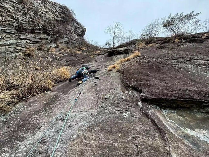 (土田た)獅子岩の一枚岩は全体的にスラブ状でガバが少なく薄いホールドを保持し上半身がバランシーなまま重心移動し、細かい足場に乗り込んでひたすら繋いでいく感じでした。クライミング要素が高かったです。グレード的には前日登った二子山の2ルートを含め3ルートとも似たようなレベルだと思いますが獅子岩が1ランク難しかったです。今後の目標としてはクライミング2年目の今シーズンは室内より外岩の回数を増やし岩慣れと技術メンタル向上!クラック岩にも通いたいです。そしてリードパートも増やしていきたいと思いました。