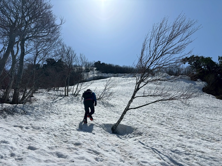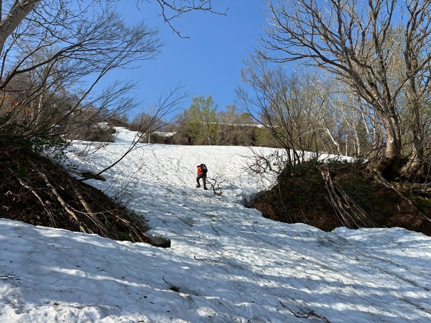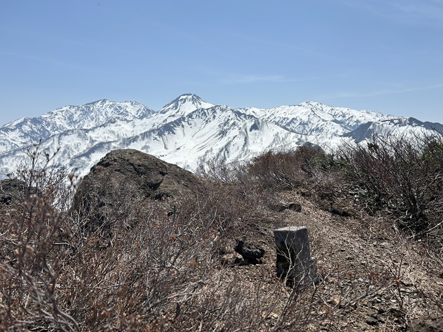 (神蔵)こ数年、雪のある時期は山にゲレンデにスキーメインの活動だったので久しぶりのツボ足登山。いつか隣の阿彌陀岳に登った際に次は烏帽子岳!と思ってからかなりの歳月が経過…。けど忘れていたわけではなくずっとモヤモヤ引きずっていたので今回山宮さんに同行をお願いしようやく登頂でき満足。ありがとうございました。先日巻機山へ登った際、去年の秋にクマに襲われ大怪我をしたという人からじきじきにゾッとする話を聞いた。対策を強化せねばと今回はクマ鈴のほかに見通しの悪い場所ではホイッスルを鳴らしながら行動。その効果か?クマに出くわした時はある程度の距離があったので良かった。最近のクマは昔と違うらしいので油断出来ないなぁと感じる今日この頃です。