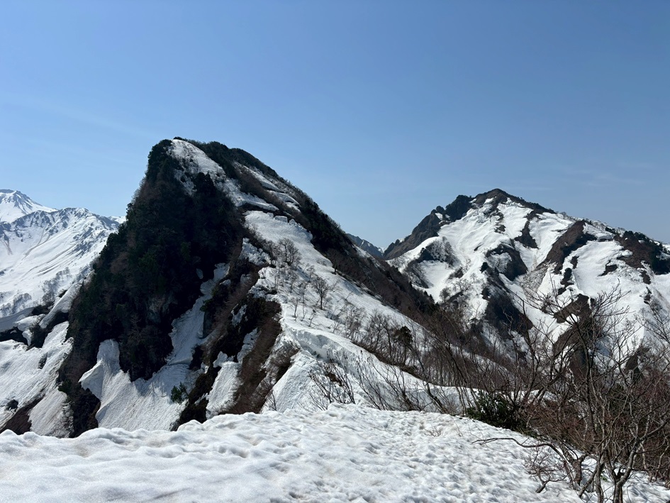 (山宮)初めて登る山で夏道が無い山・・・残雪状況がどうなのかと思ってましたがほぼ残雪を繋いで登っていくことができて良かったです。(一部残雪が途切れて藪区間もありましたが許容範囲でした。)烏帽子岳への最後の急雪壁を登るとあとは藪と岩の尾根のビクトリーロード。両サイドは崖なので落ちないよう慎重に歩きました。山頂からの景色は360°開けていて良かったです。下山時、北烏帽子岳からだいぶ下ったところ(P1012より少し上)で前方30m先の熊笹の生えているツリーホールから1.5~2mぐらいの2頭のクマ(兄弟かな?)が出てきました!!いっとき目が合ってこちらを見てましたがすぐに逃げていきました。何事もなく良かったです。