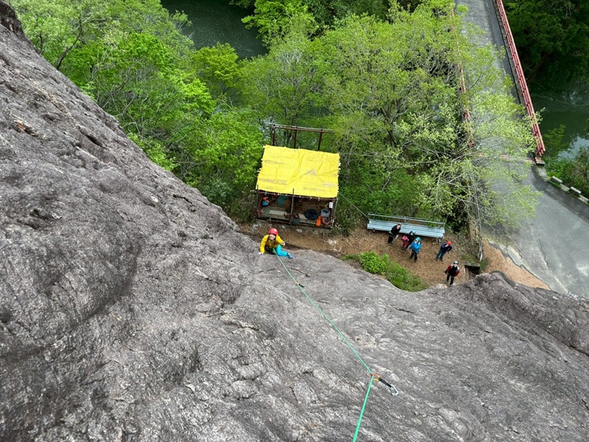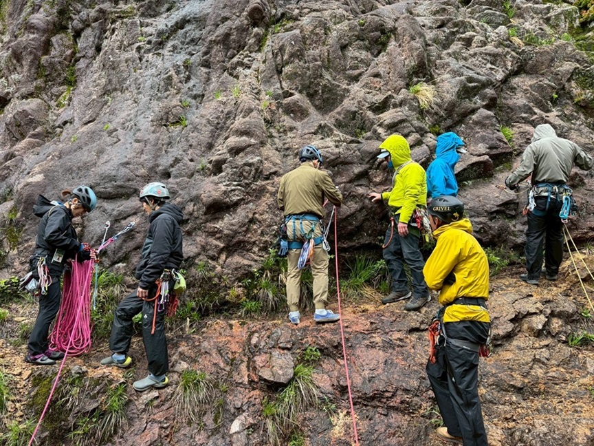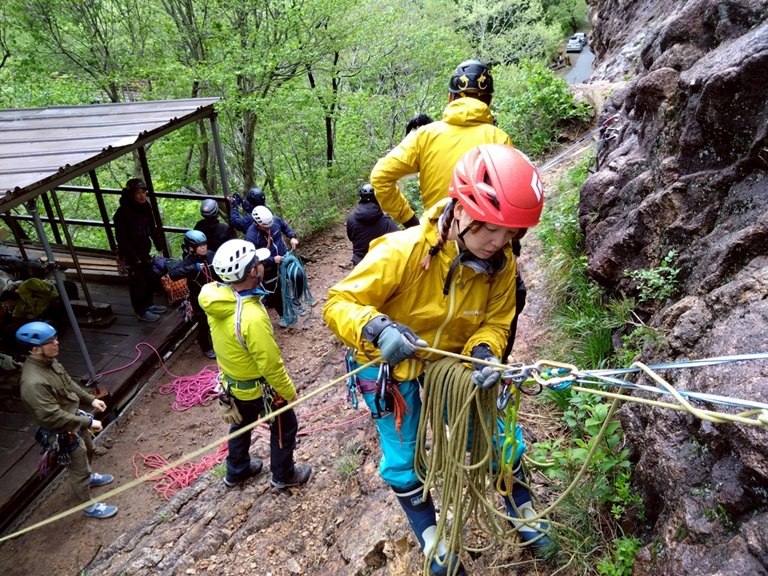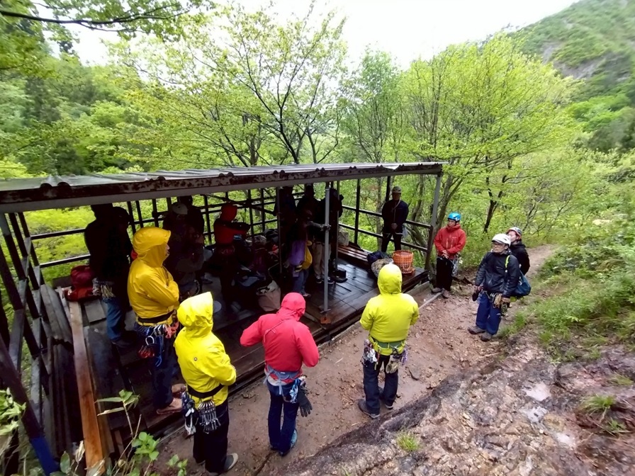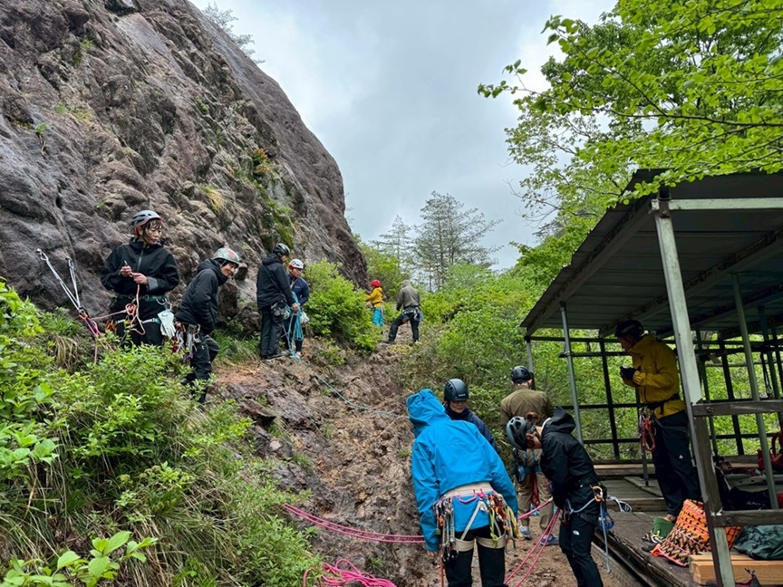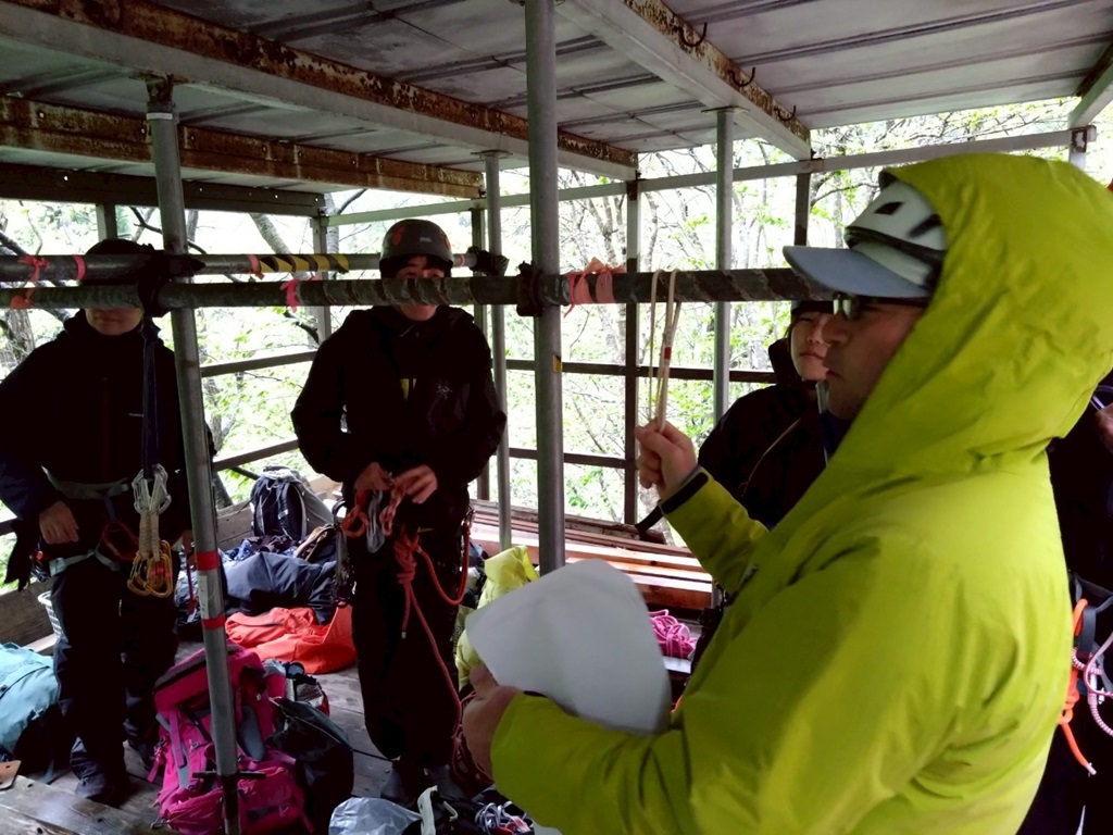 (木村ひ)午前中はあいにくの雨でしたが、東屋にて予定されていたプログラムを実施することができました。昨年の「赤谷夫人の家」の講習以来、忘れてしまっている部分も多く、反復練習の重要性を改めて痛感いたしました。自己脱出等は、普段トラブルがなければ使用する機会はないかもしれません。しかし、いざという時にはパートナーの生死を分けるほど重要な技術だと考えさせられます。今後、リードジムや外岩へ行く際の合間時間を活用し、しっかりと復習していきたいと強く思いました。プログラムの立案から資料作成まで担当者の方々に感謝させて頂きます。