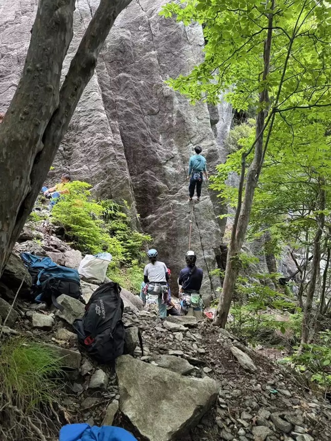 (久保田)廣澤さんに声をかけていただき黒岩に初めて行ってきました。前夜の雨で一部湿潤箇所はあったので乾いた所から登坂開始。初めはトップロープでしたが、リードでも何本か登りました。「オケラ(5.8)」をオンサイトで完登できたのは嬉しかったです。一方、ヌンチャクの扱いに課題が見つかりました。トップロープ中心だった前回と比較し、今回は少し成長できた気がします。同行メンバーのアドバイスや実演がとても参考になりました。今後も安全第一でスキル習得を目指します。