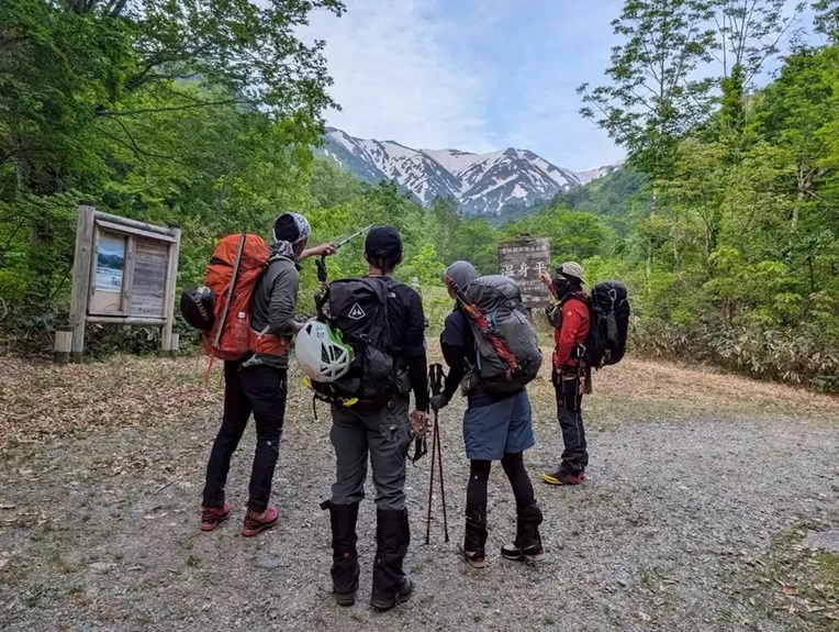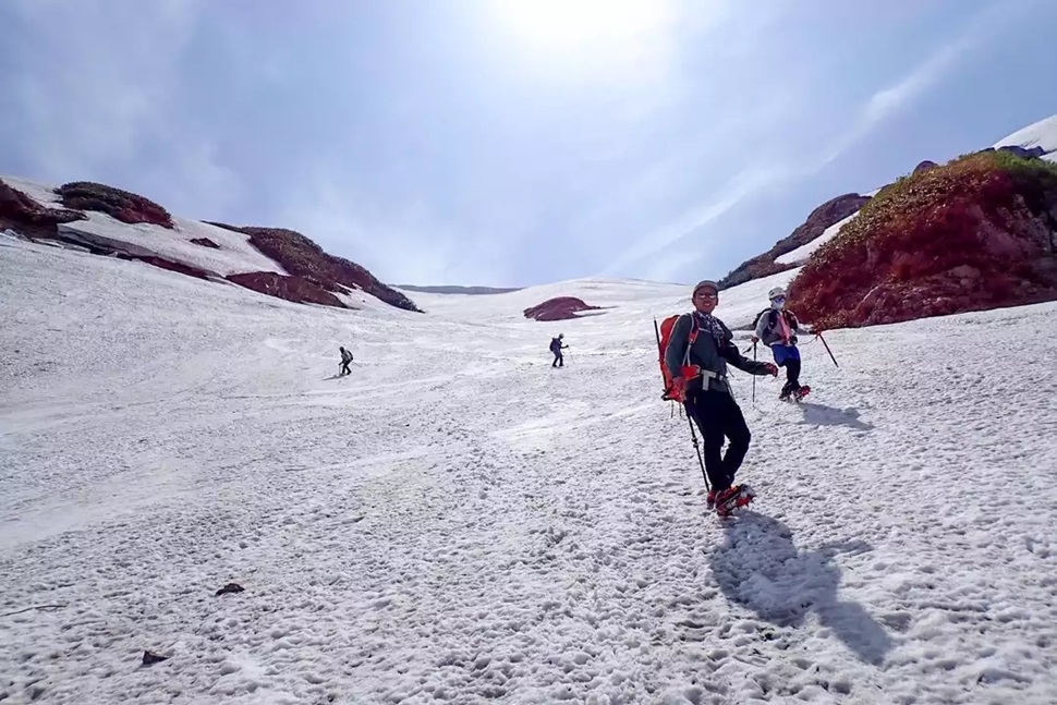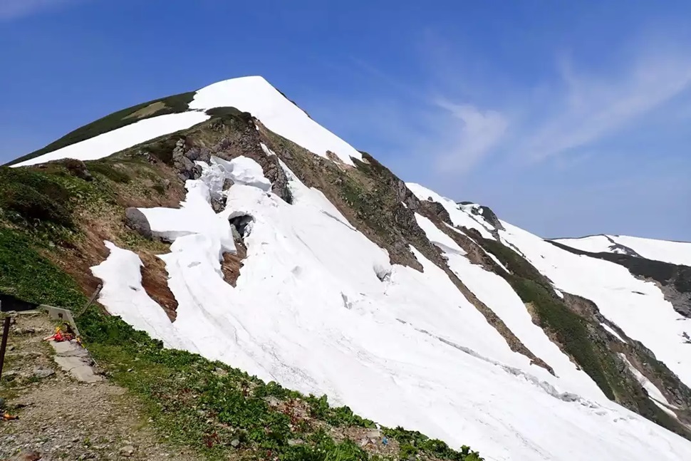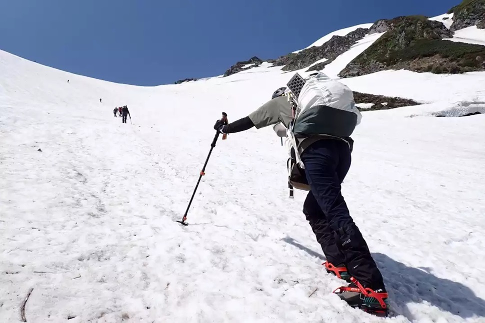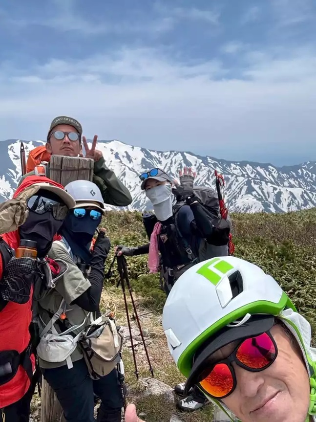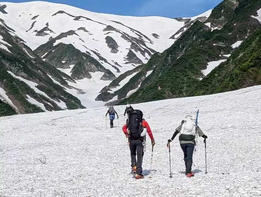 (久保田)この時期に石転び雪渓を登るのは、実に6年ぶりだった。ハクサンイチゲの盛りにあたり、頼母木方面と最後まで迷ったが、梅雨入り前の貴重な晴天。これはもう、大雪渓を行くしかない——そう決めて、石転び沢へ向かった!夏道はガレていたけど、その先に広がる雪渓に足を踏み入れた瞬間、景色は一変した。涼やかな風が、暑さを和らげ、虫を遠ざけてくれた。 見上げれば、白銀の雪面に新緑の山並み、そして澄み渡る青空。これ以上はないと思えるほどの一日だった。登るにつれて、雪渓は傾斜を増していく。だが、目の前に広がる圧巻の景観に心は踊り、なぜか疲れを感じない。どの一瞬を切り取っても、絵になる景色ばかりだった。梅花皮小屋で昼をとり、北俣岳を経由して門内小屋へ。そこから門内沢を下っていく。下りも決して楽ではなかったが、仲間と声を掛け合いながら進む時間が、何よりも心強かった。タフな仲間たちを待たせてしまう場面もあったが、そのたびにかけてもらった言葉が背中を押してくれた。最初から最後まで、歩いて、しゃべって、笑い合った。そんな時間が、何よりの宝だと思った。この最高の一日に、そして共に登ってくれた仲間たちに、心から感謝したい。