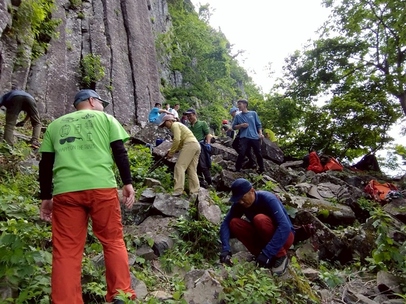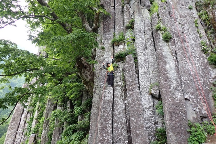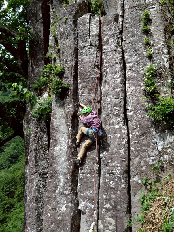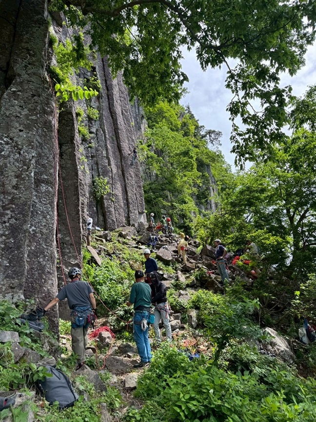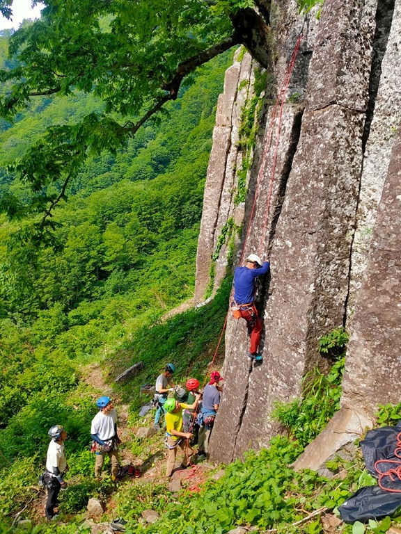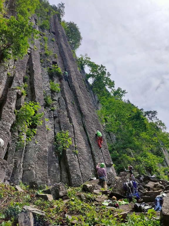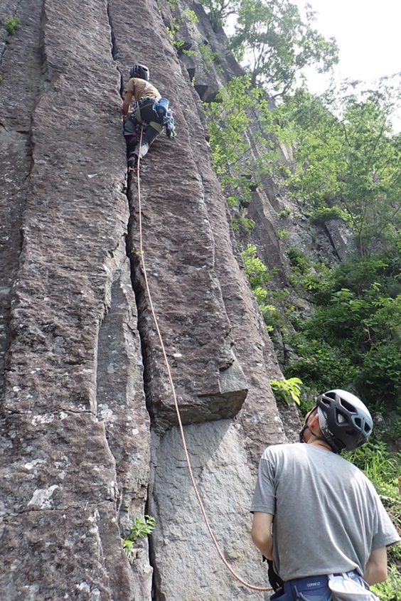 (竹内)今から8年位前【クライミングの基本はクラック】と思い込み、労山理事長川嶋さんや今は亡きガイド、杉野保さん等に師事して来ましたが、NCCでクラックやる人は数人でした。ところが今回新人も含め18人も参加し、嬉しい限りです。昨年から、佐藤ゆ氏が入会し、布岩開拓などますます盛会になって来ました。私は皆さんから【クラック登りでなくレイバック】と言われ、相変わらず上達出来ますせん。クラックのリードは、カムのセットを体得すれば、ボルトより安全と言われています。今回数人が擬似リードに挑戦していました。今後も計画があるようなので秋に向けて挑戦していきましょう。