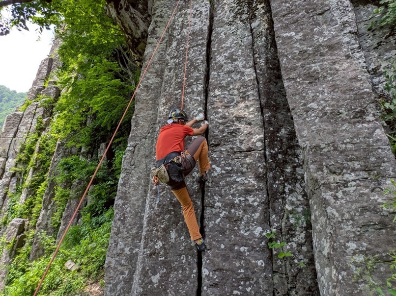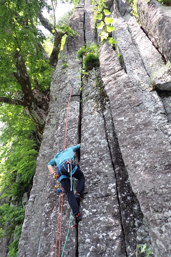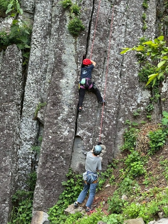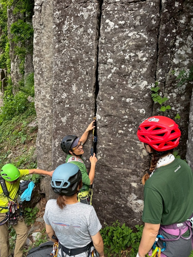 (永井)前日入りで2日間参加させて頂きました。プロテクションやジャミング等クラッククライミングの基礎知識をリーダーの吉川さんから学ばせて頂きました。2日間ともに暑い日でしたが、大変お世話になりました。ありがとうございます。実際に登ってみて感じた事は、想像以上に手足が痛く…手の擦過傷の痛みが登る気力を奪い、2日目にいたっては1本~2本のチャレンジで終わってしまいました。1日目に羽田さんからジャミンググローブをお借りし、なんとか練習ルートを登る事ができましたが、課題は多く、日々の練習の必要性を強く感じました。夜の部は、とても楽しい時間を共有させて頂きました。ありがとうございます。