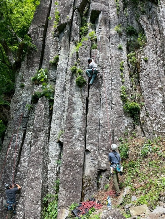 (久保田)初めてのクラッククライミングは大変貴重な経験となりました。YouTubeの動画だけでは具体的なイメージを掴むのが難しく感じておりましたが、吉川さんをはじめとする先輩方の御指導と的確なアドバイスが、非常に参考になりました。初日は、都度確認を行いながら、徐々にクライミングの感覚を掴んでいく一日となりました。夜は、和やかな雰囲気の中で美味しい食事を囲み、皆様との親睦を深めることができ、大変有意義なひとときでした。羽田さん、貴さん、おもてなしとお食事ありがとうございました。2日目は、前日の学びと反省点を踏まえチャレンジしました。初日に登れなかったadd2.5を登り切ることができた際は、達成感を感じました。最後に挑んだ「楓」では、テラスまで手が届いたにも関わらず、力尽きてしまったのは大変残念でしたが、次なる目標と課題を見つけることができました。初日は厳しい側面もございましたが、二日間の参加を通じて、クラッククライミングの奥深さと楽しさの一端を理解できたように思います(多くの擦過傷は残りましたが)。この度の機会をいただき、誠にありがとうございました。