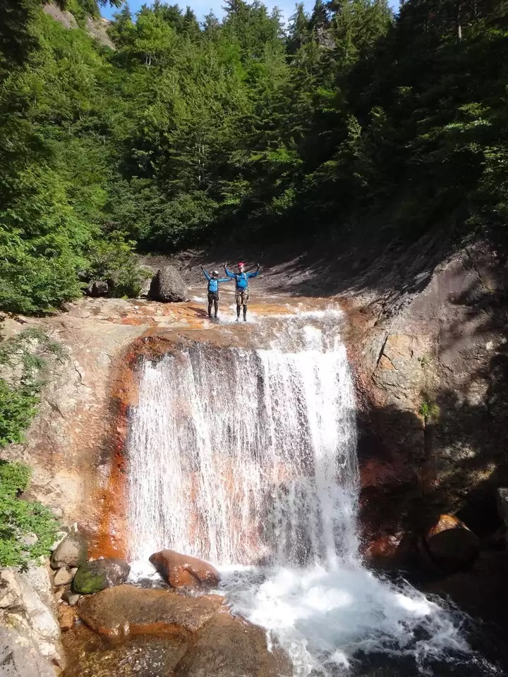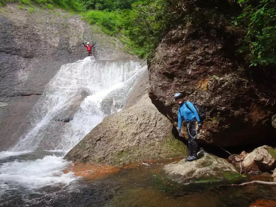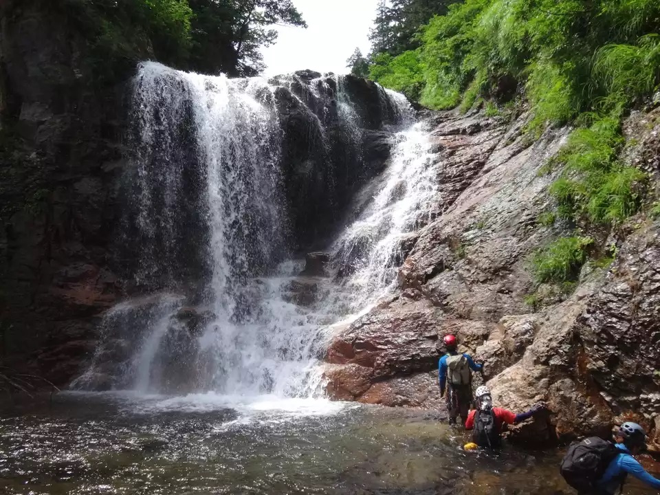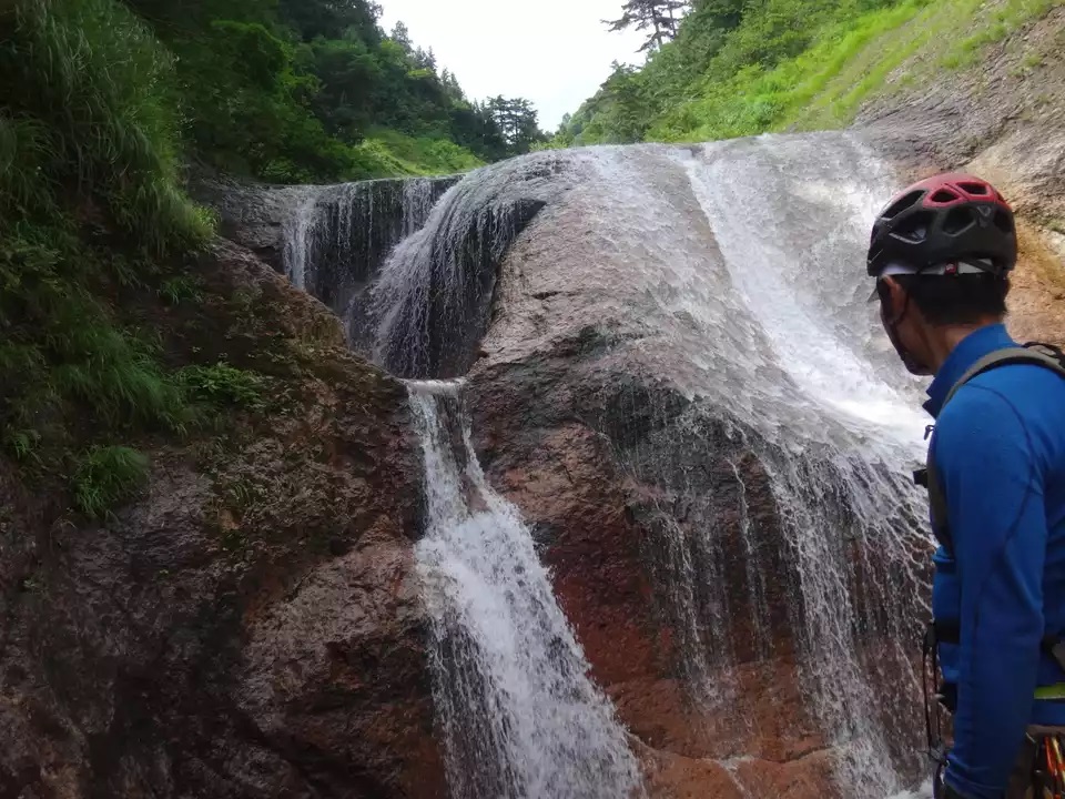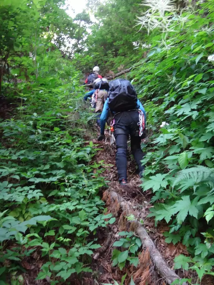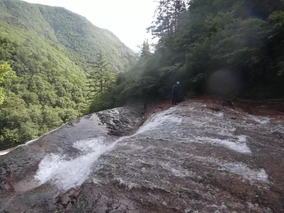 (進藤ま)今回は荒木くんと沢登り始めたばかりの中山さんとで前川大滝沢のへ行ってきました♪記録を探してみると…5年ぶり〜 そんなに来てなかったんだ。今回は初めて滑川大滝の高巻きを小さく高巻くルートで行こうかなと満さんが言っていたので、それならばと昨年のmasuzoさんの軌跡をダウンロードして出発♪ 朝イチ集合した場所でmasuzoさんのお友達のKeyくんらしき男性を発見しましたが、それほのど面識もないのでご挨拶せずでしたがきっとmasuzoさんと待ち合わせして同じく前川大滝沢へ行くんだと思っていたら、そのあとのトイレ休憩の道の駅飯豊でmasuzoさん達とお会いしてしばし談笑♪やっぱり前川大滝沢とのこと。 masuzoさん達は前回同様、上から自転車で降りてきてからの入渓だそうです。 それにしてもやっぱり前川大滝沢は快適な沢登りですね。今回もラバーにしましたがどこも滑る気はしなかった♪ でも途中の二股で大きな熊に遭遇したのは焦りました。危うく荒木くんと中山さんが…満さんが気づき事なきを得ました その後は満さんが笛を吹きながら遡行を続行。声を出すより笛のほうが大きい音が出て良いみたいですね。下山で沢へ降りる道へと行ってしまい登り返しが辛かったですが、とにかく楽しく安全に沢登り終わって良かったです。ちょっと遠いけど虫の心配もないしまた行きたいです