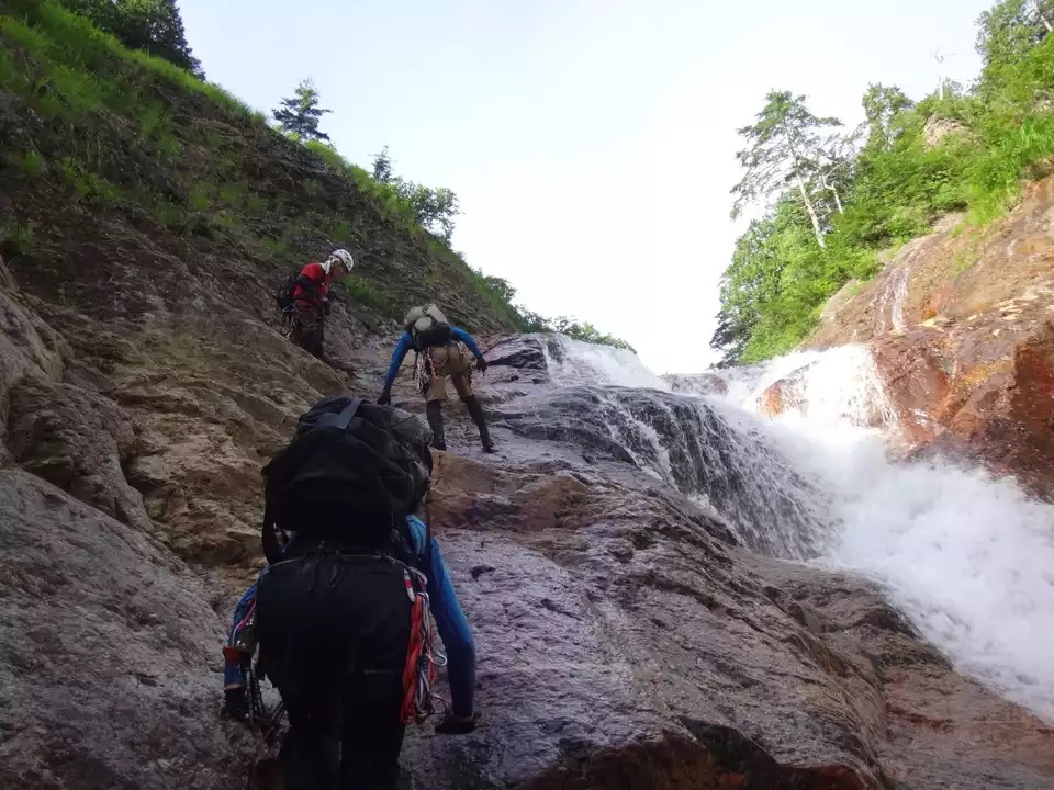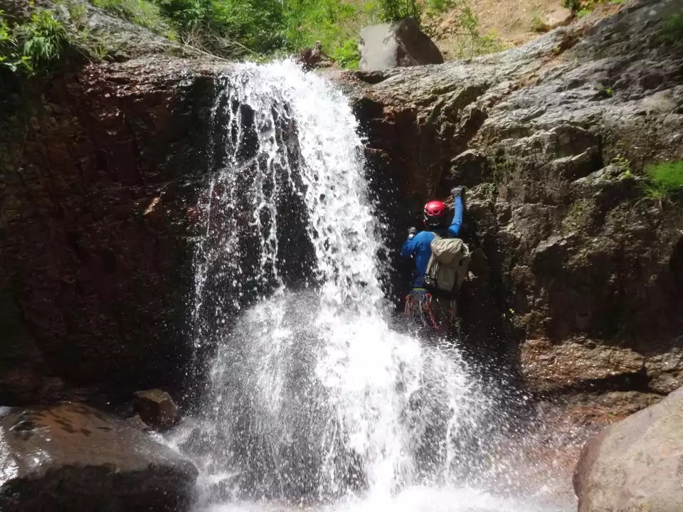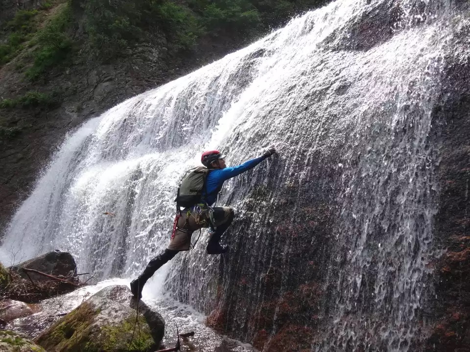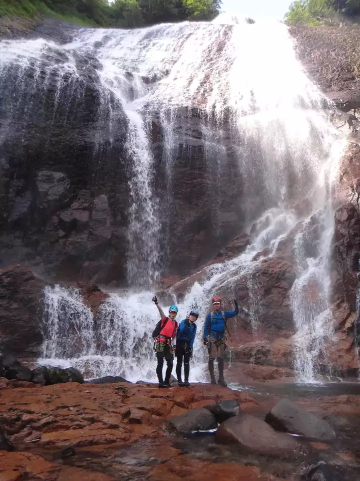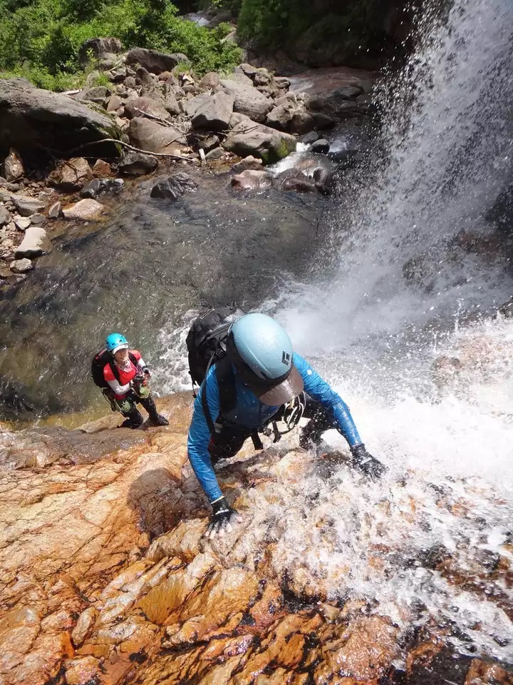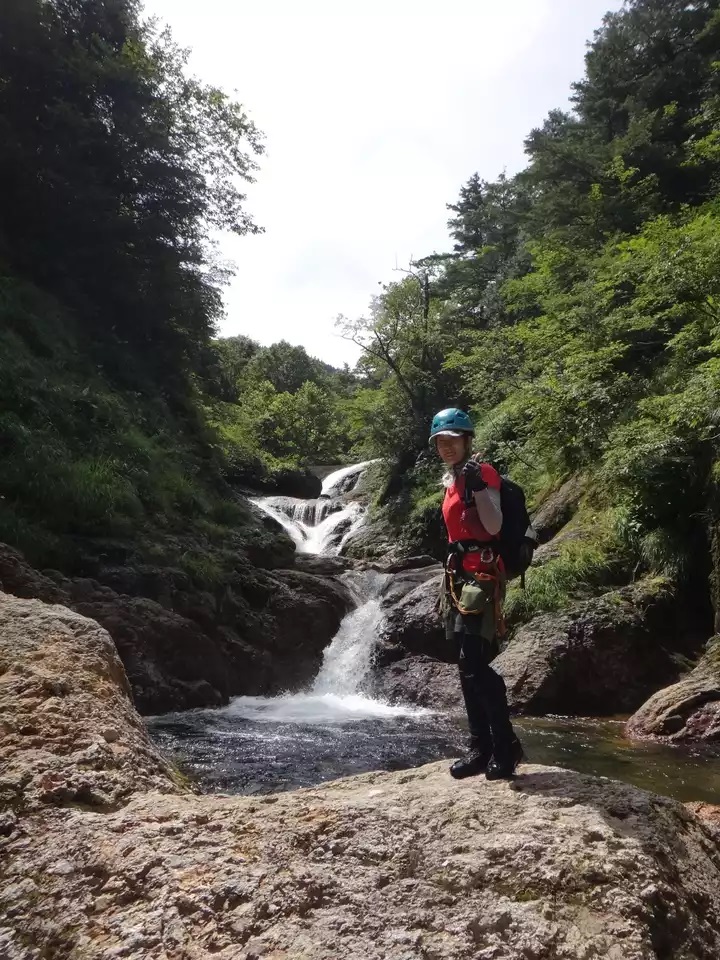 (中山)今回で沢登り2回目の参加でした。小倉沢よりも沢の幅が広く開けておりとても歩きやすく、景色も良かったです。沢靴はフェルトを使用しましたが、何回か滑ってしまいました。同じフェルトソールだった荒木さんは全然滑っていなかったため、歩行技術でこんなにも違うのだと実感しました。また、初クマとの遭遇でしたが満さんが、いち早くクマの存在に気がついて下さったので事なきを得ました。沢登りに夢中になる、足元しか見ていないとクマとの距離を縮めてしまうことになるため、登山中もそうですが、周りを良く見ることも重要だと思いました。自分の存在を知らせるための熊鈴や笛は最近のクマは効果がないと聞きますが、何かあった際のことを考えると何も持っていないよりかは良いと思いました。