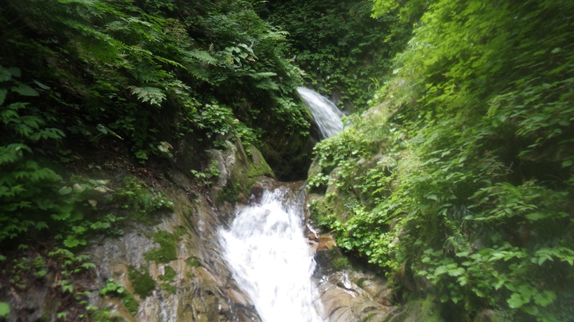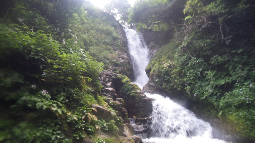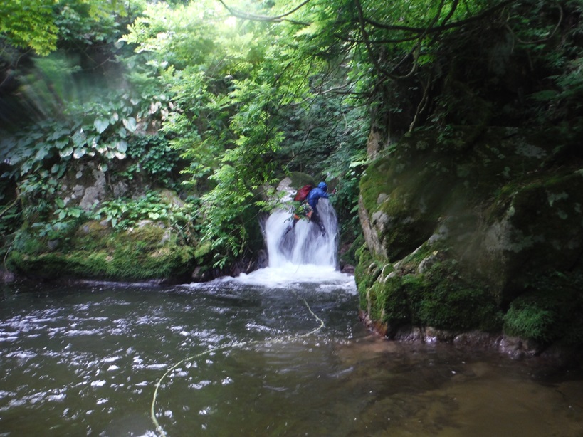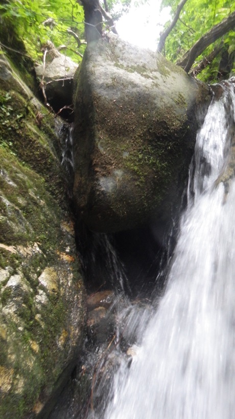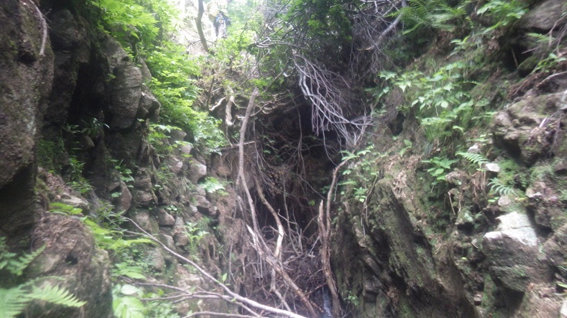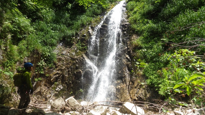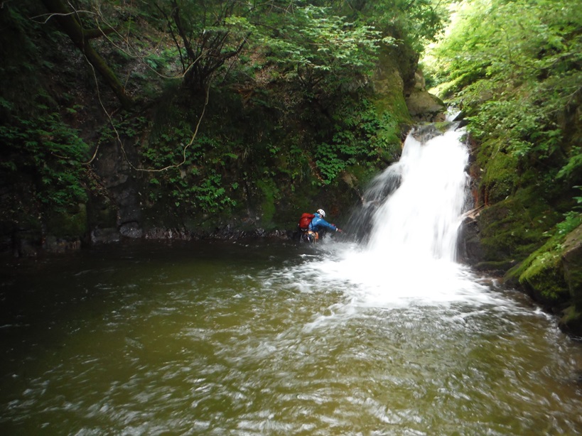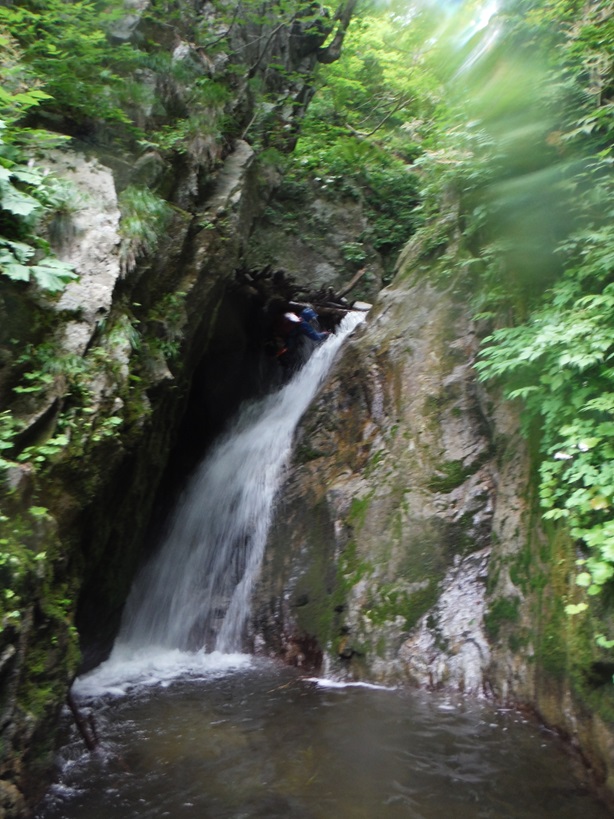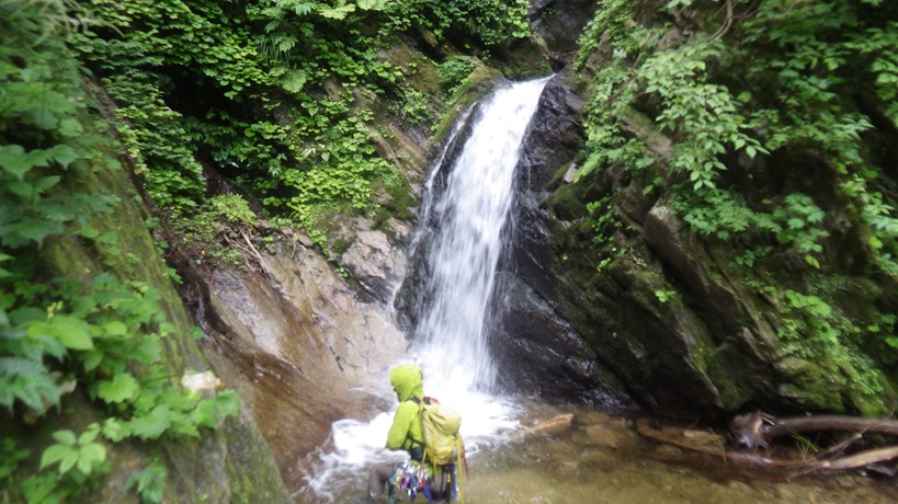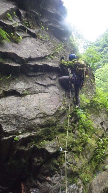 (山宮)今までショートカットしていた下部ゴルジュ帯を初めて登りました。高巻きばかりで面白みがないと聞いてましたが高巻いた場所は1箇所のみで(その高巻きも簡単な高巻き)楽しめました。下部ゴルジュ帯だけでも沢登りトレーニングになるので会山行でどうかなーと思いました。(ただし泳ぎが苦手な人は止めておいた方がいいです。)今回の山行は登れそうなところはできるだけ登って高巻きは極力しない方針でした。結果高巻きは下部ゴルジュ帯の滝1つ、大荒川本谷の滝1つ、入り三階の滝の区間、大ヤゲンの区間の4回でした。高巻き自体もそこまでの悪さはなかったです。岸畑さんが海の日までぐらいは虫がいないと言ってた通りアブやブヨの類の虫がいなくて良かったです。帰宅後に毛虫(チャドクガ?)被害のブツブツ出てきて痒いです・・・(最後の藪漕ぎのせい?それとも松平山からの草刈りのしてない草茫々登山道のせい?五頭の沢ではいつもコレ!)佐藤さんの感想にある通り大荒川本谷は魅力的ではないので1回登れば次は無いかな。ただ登れない滝ですが入り三階の滝は迫力があるので見る価値はあると思います。初めから終盤の藪漕ぎ少し前までレイン上を着て登りました。水は冷たくなく丁度良かったです。また水泳用ゴーグルが大変役立ちました!