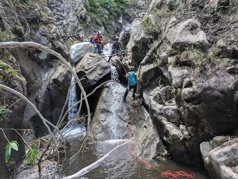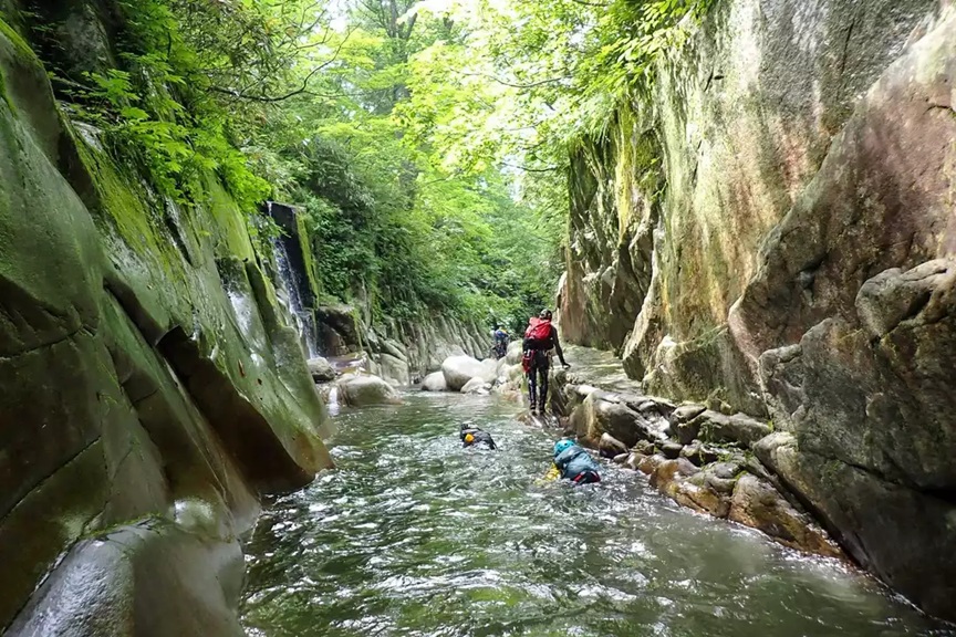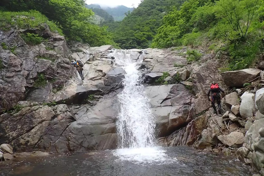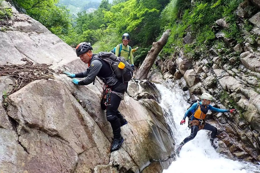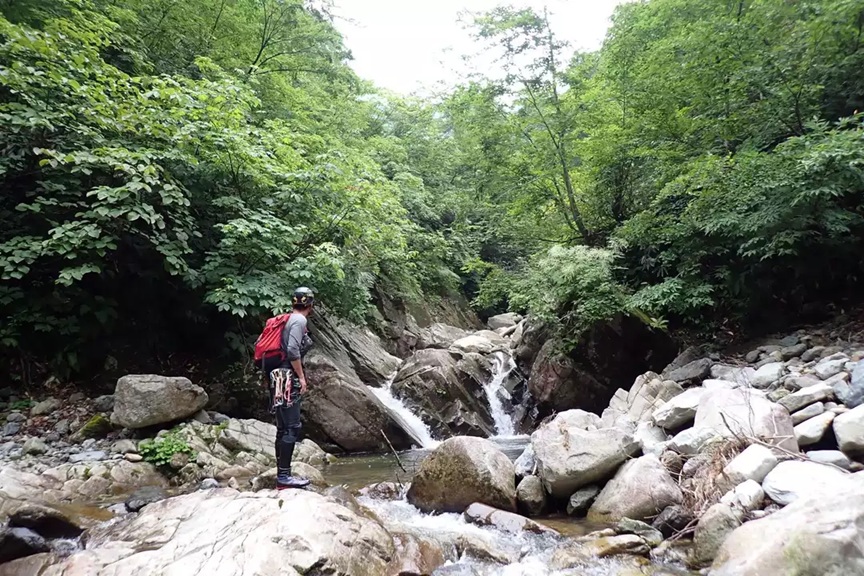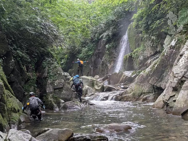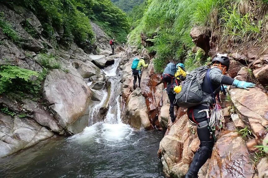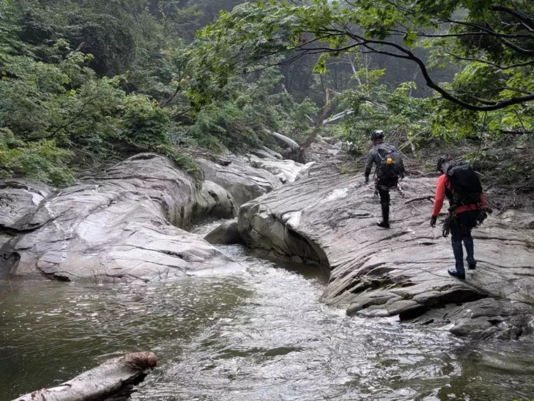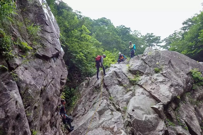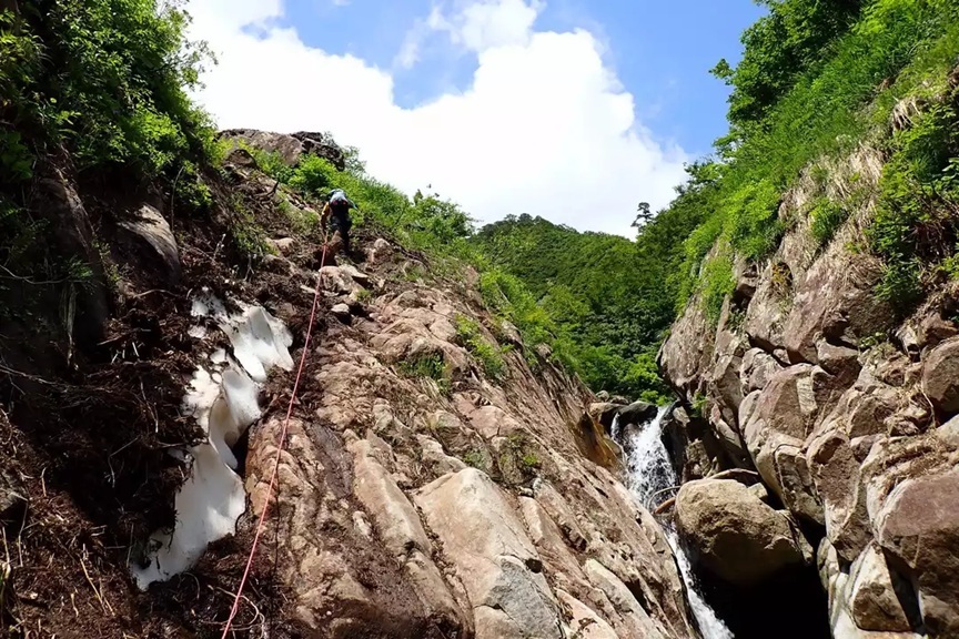 (永井)数年前に沢を始め、グレードの低い沢からチャレンジし、10数箇所は登った頃このまま続けたらいつか死ぬかもしれないと封印した沢登り・・・数年たって山仲間からの紹介で今年の春から山岳会に入会。ローブワークやクライミングの基礎を学びつつ、なかなか覚えられないし登れるようにならない・・・が、暑いし沢登りに行こう〜٩(°̀ᗝ°́)و宮城県と新潟県の山岳会memberで井戸小屋沢に行ってきました♪が、途中敗退となりました。それでも数年振りの沢登りは とても楽しかったです♪