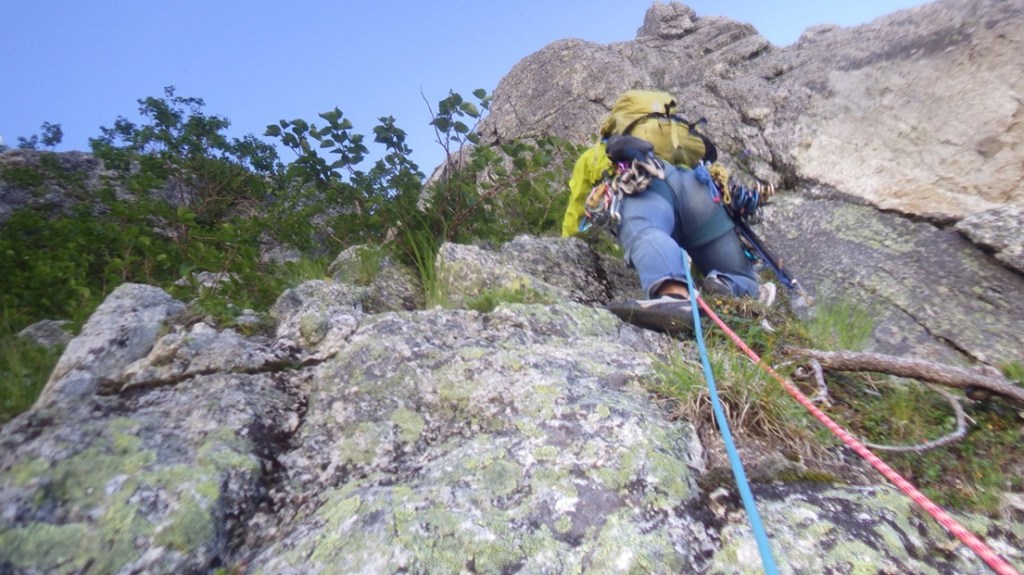 【5P 白い岩直下のハイマツ帯~白い岩左のクラック~ハイマツ帯(源次郎尾根上) 50m Ⅱ~Ⅲ】(佐藤ゆリード)
