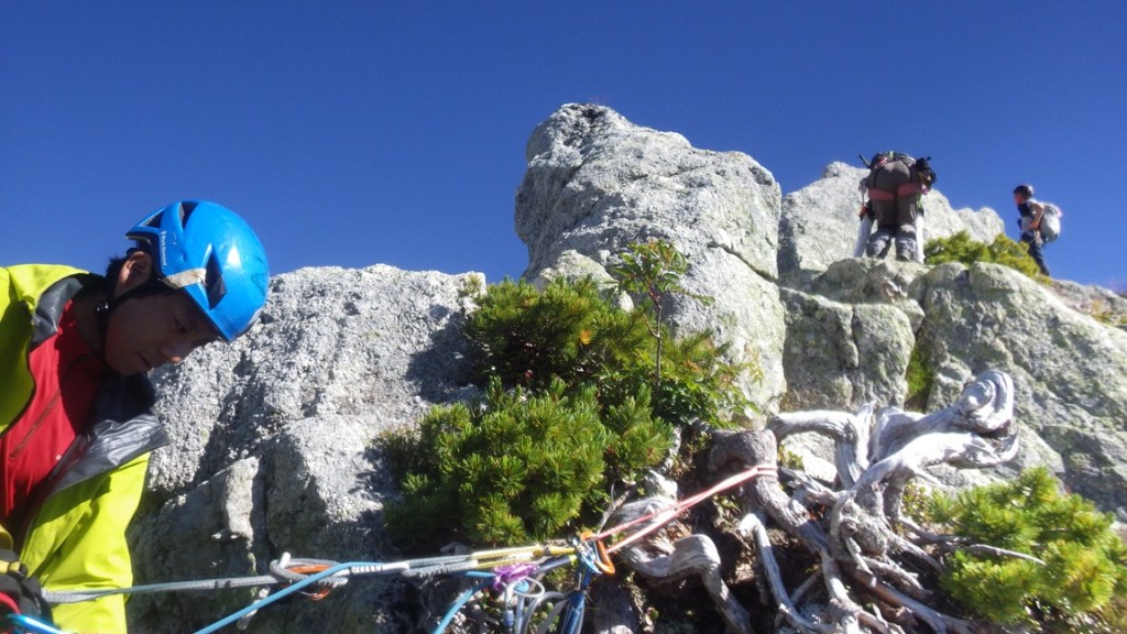 ・ハイマツ帯の途中に平らで開けたところがあってそこが本来の終了点かと思いますが佐藤さんは残りのピッチのことを考えロープを目一杯伸ばして白い岩の下付近の中途半端な傾斜のところでハイマツ帯にスリングで終了点を構築。
