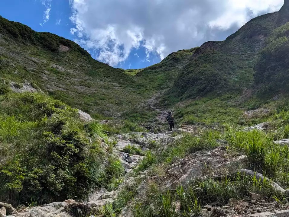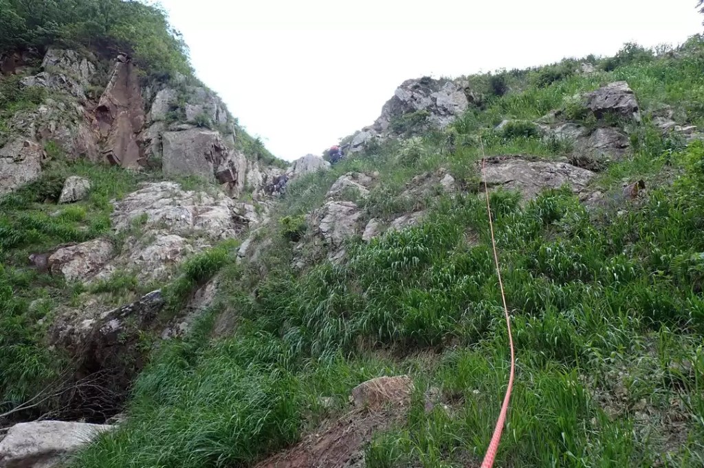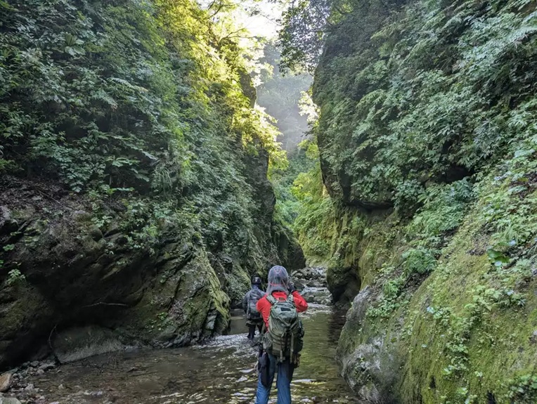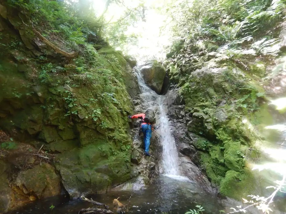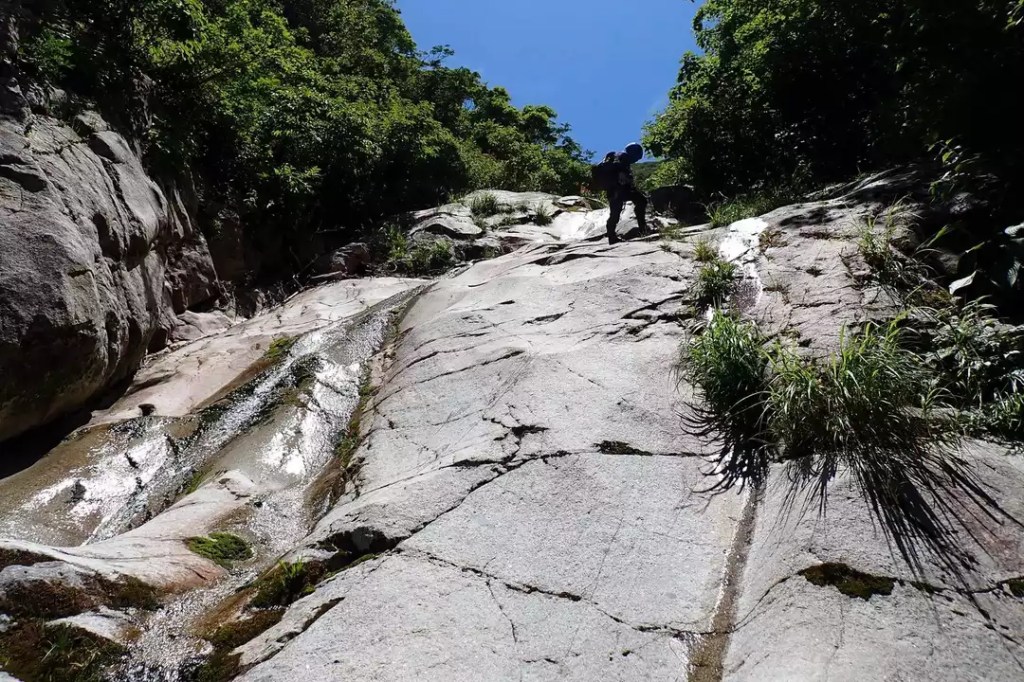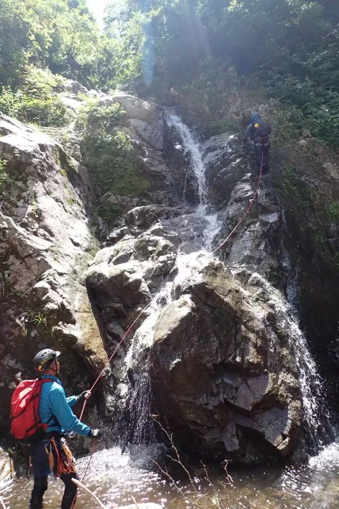 (土田た)シーズン第二弾は、難渓が名を連ねる朝日連峰でも比較的規模も小さく登りやすいとされてる祝瓶山の角楢沢へ行ってきました。両岸に手がつくような下部ゴルジュ帯から始まり、中流部は息つく暇もない連爆帯、源頭部に向けては延々と続くスラブ帯と終始見せ場が連続する名渓でした。ただ小雨の影響かヌメりが多く、谷間の堆積物も非常に多かったです。高さのある滝はロープも多用し時間がかかりましたが無事安全に下山でき満足いく冒険でした〜。脱渓後は暑くて体力気力も限界一歩手前