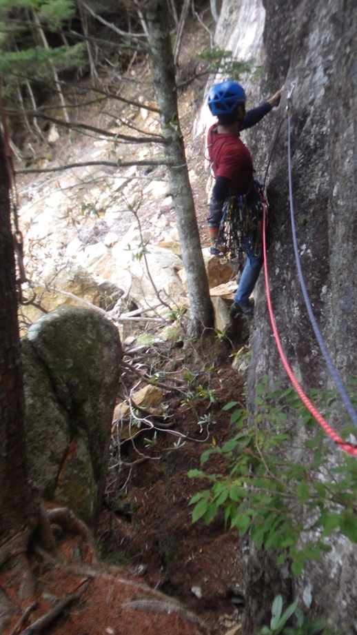 ・凹角内上部の抜け口はスタンスをフレーク内にスタックさせて立ち、抜け口上のスラブの細かい粒を持って身体を上げようとしましたが登れず2回フォール。結局ロープを掴んで抜け口上まで上がりました。スラブは中間も1箇所悪かったです。