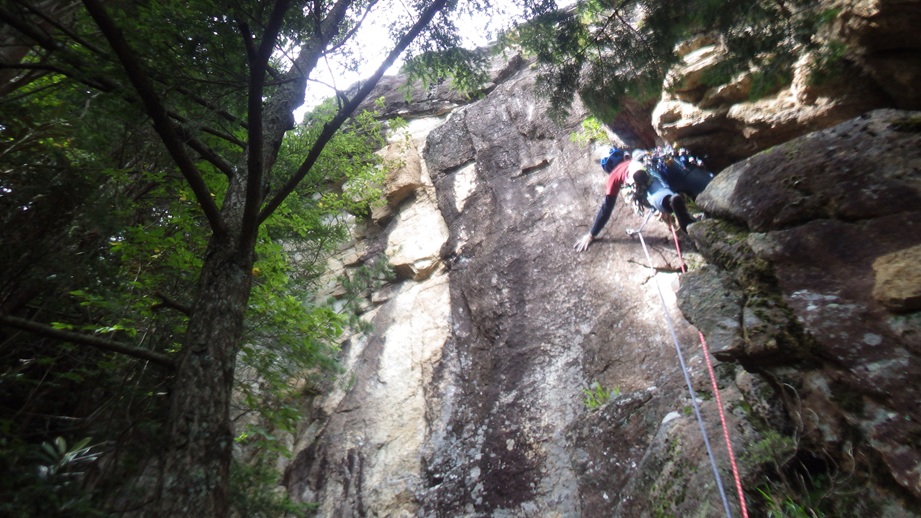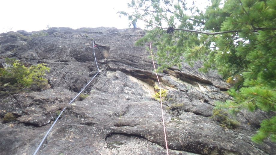 ②4P目終了点から2P目終了点から見て左上の足場の良いところまで下りて、残置スリングのある木まで少し歩いて下りる。
