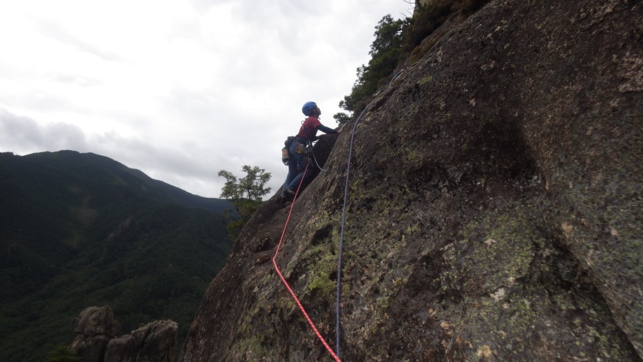 (山宮)午後からの天気予報が微妙だったので朝早くから出発したら1番手で取付に到着できました。こんな天気予報が微妙な日は他に誰も来ないだろうと思っていましたが、下降時に後続パーティーを2組見ました。人気ルートなんですねー。佐藤ゆさんはオールリードで登攀してオンサイト。流石です。私はフォール、テンション、A0とダメダメクライミングでした。2P目の抜け口上のスラブの細かい粒を掴んで身体を上げるのはスラブ粒を掴める保持力が今現在無いしそんなに短期間で保持力が付くとは思わないので厳しいかもしれませんが、他のところはトレーニングすれば何となりそうなので頑張って再チャレンジしたいと思います。