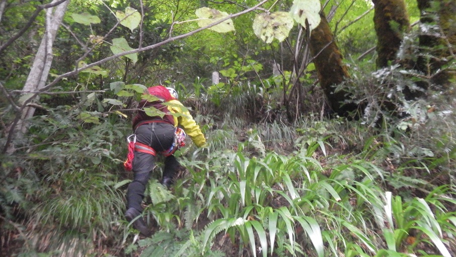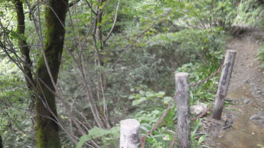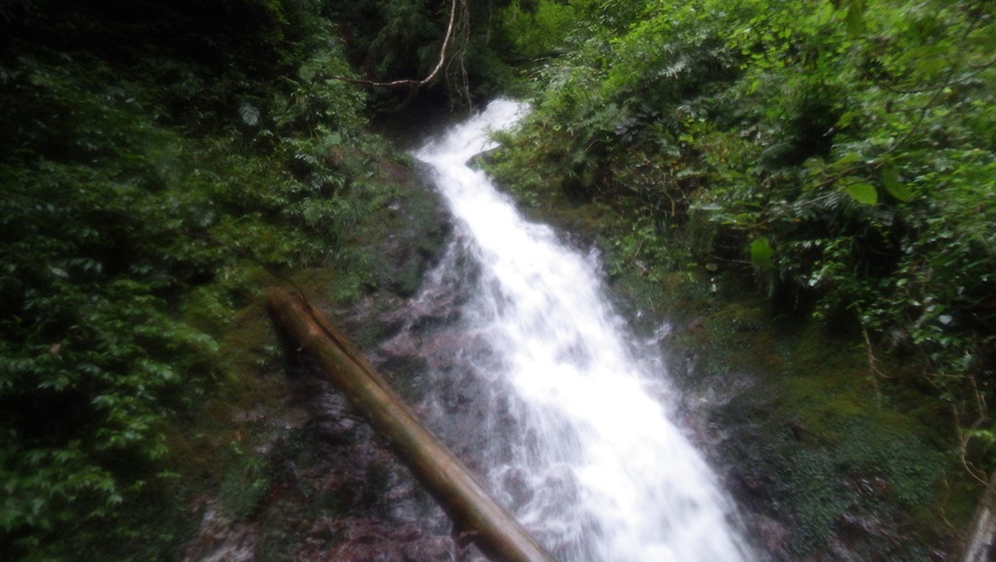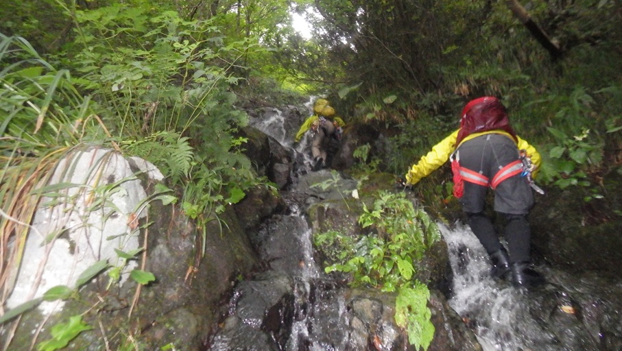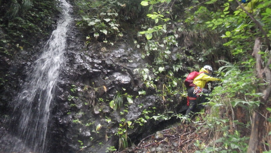 ・呑み水の滝から右に見えている階段状の滝をフリーで登ると次に濡れた垂壁の滝が現れます。これを登らずこの滝から右に5分ぐらい籔漕ぎすると一般登山道に合流します。