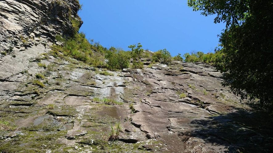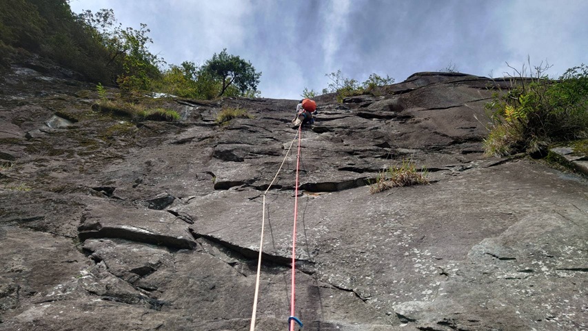 (土田し)ずっと登りたかった子持山獅子岩だったので、取付きに辿り着いて岩壁を見上げたときは、ついにやって来たぞ!と嬉しさで胸がいっぱいになりました。ただ意外と寝てるような壁を見て楽勝なのかな?と思ったりもしましたが、リードした1p目の核心でかなりまごついていきなりA0しかけたのには焦りました。それでもなんとかトップアウト出来ましたが、個人的には5.9くらいのグレード感で、杉滝ではスリラー、マドンナ、コスモス、競技会が登れてるとなんとか登りきることが出来るのかなと思いました。自分の場合は、小川山ストーリーと競技会の核心のカチが持てるようになったのが大きかったです。マルチはつるべでクライミングするとかなり達成感があるので、これからもトレーニングに励み色んなマルチのルートにチャレンジしたいと思います。