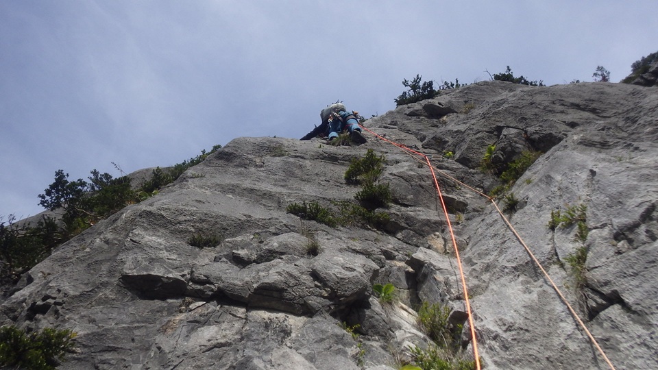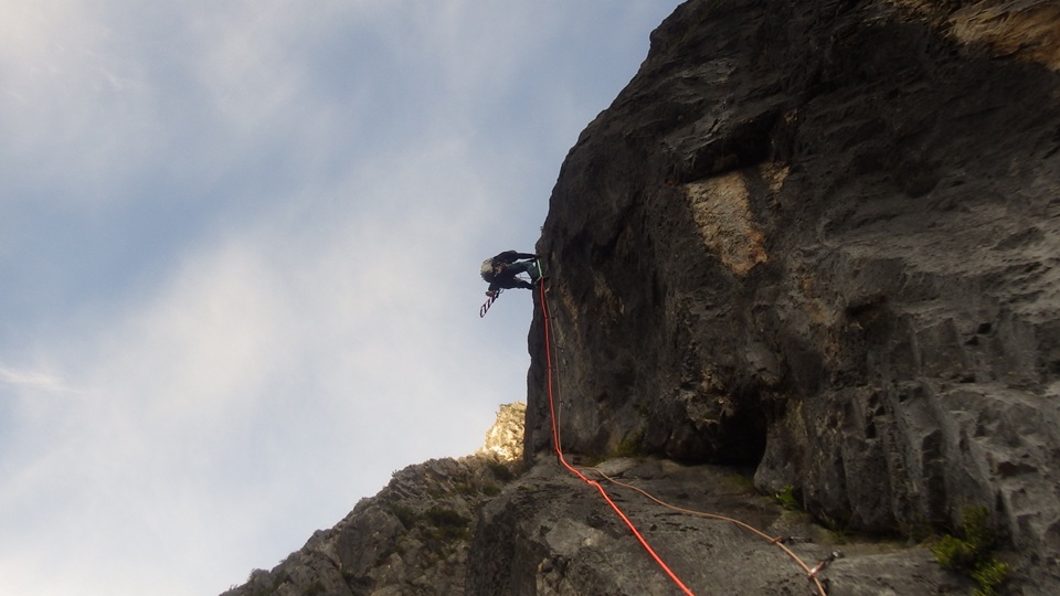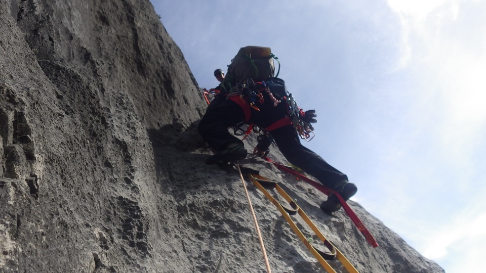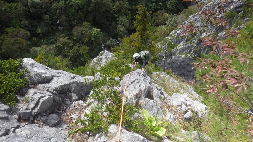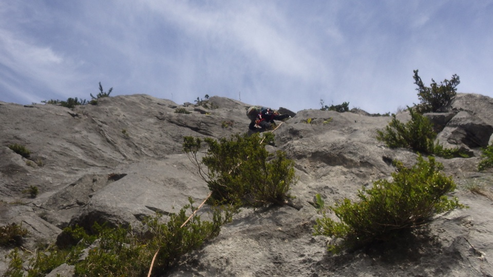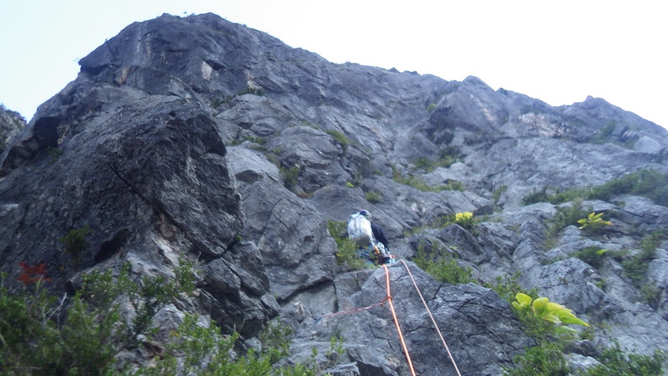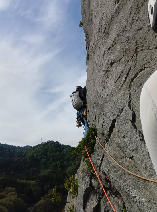 ・土田しが1~5P(トポ4~5Pは継続して登る)をオールリード、その後はフリーで左岩稜登攀終了地点まで登る。