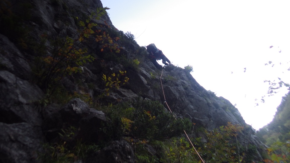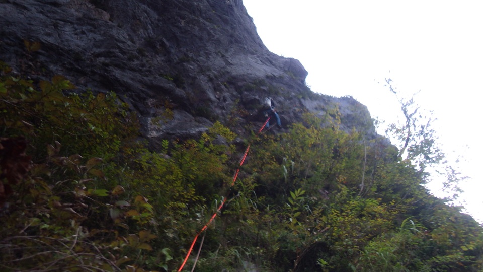 (三富)朝まだ暗いうちに駐車場に到着したが、道途中から見た岩壁が大きくて今からこの壁を登るかと思うと何とも言えない気持ちになりました。小滝川を渡河では飛石沿いに渡れず靴を脱いで渡る。1P(Ⅴ-)と2P(Ⅳ)はビレイでセカンドです。最初の登りは緊張していてはいましたが落ちないように慎重に登る。3P(A1) のアブミルート自身心配していたルート、やはりというか両手を上手く使えてないせいかアブミに足が乗れず最後は腕がバンプして休み休み登る事に、ハンガーは20個ぐらいあったような・・・5P(Ⅲ)6P(Ⅲ+)はトップ忍さんが屈曲した岩にロープが掛かったりしていたせいかロープの引き上げにとても苦労していたようです。大岩で小休止、灌木まじりの岩をロープ無しで登るがルートがはっきりしていないので行きずまりトラバースしたりして危ない時があったルートの見極めは慎重にと反省。終了点の松の木からトラバースしてロープ沿いに1時間くらい下ると小滝川送水菅に出る。ここは飛石沿いに渡れました、後は道沿いに戻って駐車場へ。反省点としては、アブミの使い方(2段目に足乗せしてのレストが上手く出来ずに腕が疲れてしまった事。ルートの見極め(目の前の登れそうなところを登って行きずまった事。装備慣れ(マルチの装備に慣れてない事。他にもありますがまだまだマルチ慣れしておらず連れて来てもらったという感じでしたので、手早く出来る様に繰り返し練習します。