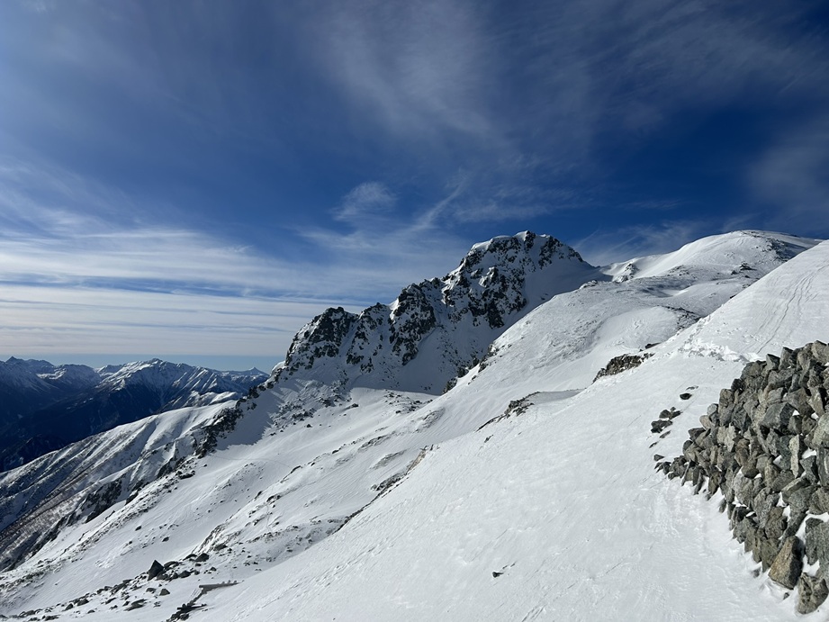 (山宮)今回は龍王岳南面フランケのA~E稜、三峰南壁ジェードルルートの登攀も視野に入れ入山しました。龍王岳は初見で岩場の状況は分からず(ネット記録はほぼ無し。)南面で雪もたっぷりついていることが予想されたので先ずは偵察ということで東尾根を登ることにしました。東尾根から南面フランケの壁を見ると案の定、雪がたっぷり付いていて登攀は除雪登攀になり時間がかかることは容易に想像できました。また壁が立ってないところの雪はキノコにはなっていないものの処理が難しそうで無雪期に比べると難易度がグッと上がっている感じでした。この時期のこの辺りのルートの記録がほぼ無いのが良く分かりました。最終日にバス最終便に間に合うよう登攀するのは難しい(シーズン始めの足慣らしのつもりだったのにいきなりトップギアに気持ちを入れて登攀する準備してなかったし、する気もなかったので、)今回は東尾根だけ登って帰ることにしました。東尾根は特段難しいところはなくフリーで登ってトップアウトしました。3日間共暖かかったです。陽が照っていない朝晩や夜は冬なので当然冷えますが気になるほどの寒さではなかったです。3日間、登山者やスキーヤーが大勢いて賑わってました。雷鳥沢テント場も賑わってました。レジャーランドなのかと思うほど賑わってましたが、雪山は静かな方が好きです。