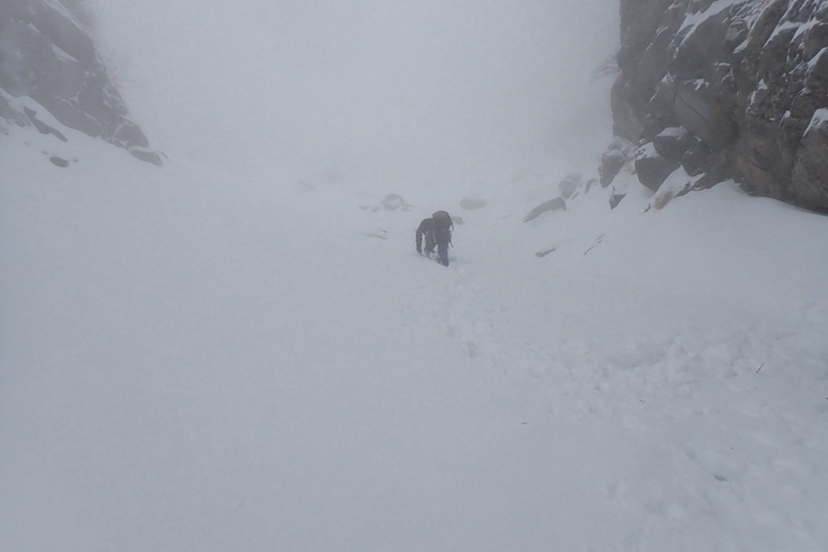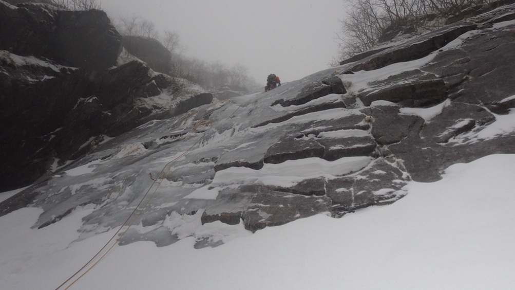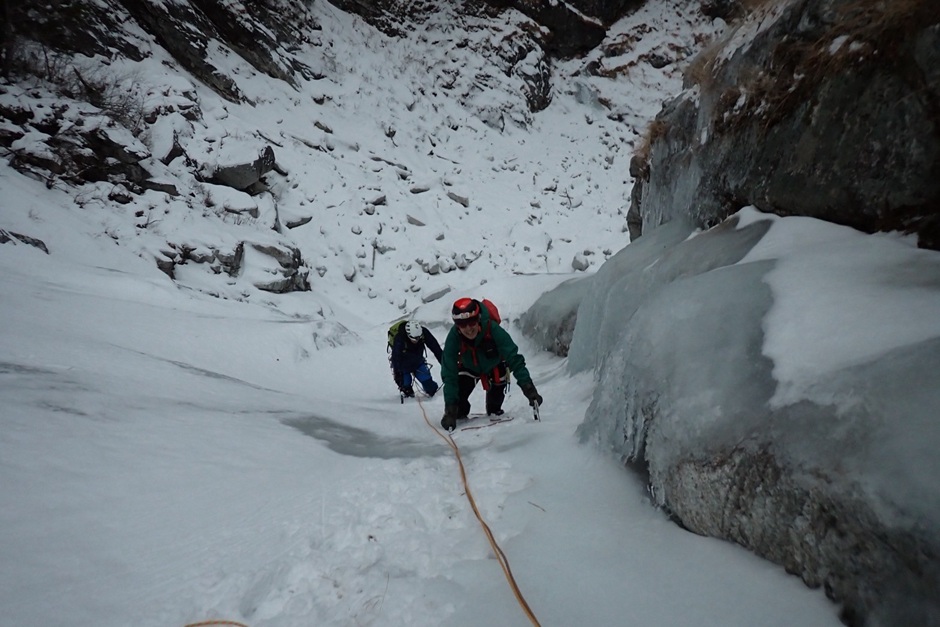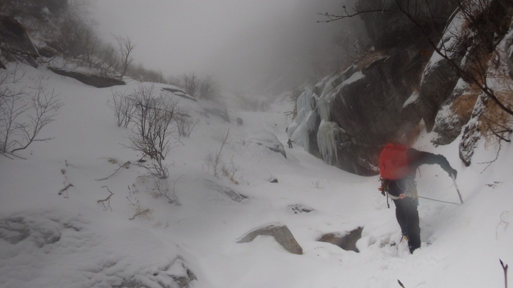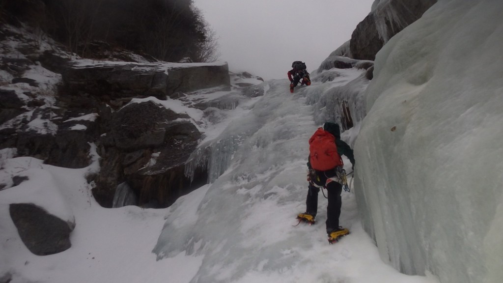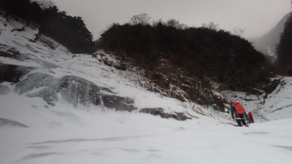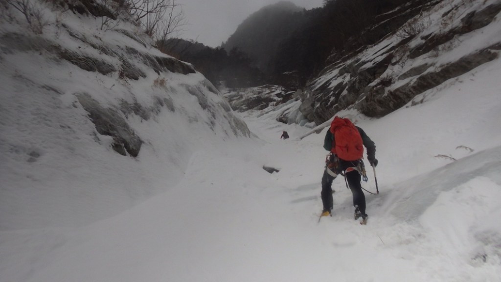 ・緩傾斜帯の氷は雪に埋まっていて氷の回廊とはならず雪山登山でした。