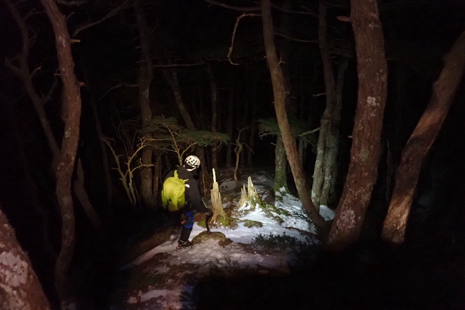 (土田た)今シーズン目標にしてたアルパインアイスの黄蓮谷右俣、無事完登でき嬉しかったです。初日は季節外れの気温で暖かく快晴の1日でした。pack weightは約17kgでスタート。2合目辺りから薄っすら雪道になり3合目手前の富士見平でチェンスパ装備。重たい冬靴での長いアプローチが身にこたえました。明日の長い戦いに備え一定のペースで一歩一歩ゆっくりと歩を進め6時間で七丈小屋に到着。(小屋までは秋パン、メリノロンTで快適)この日は我々と他2名のほぼ貸切り状態でのんびり快適に過ごせました(週末の荒天で土曜日含めほぼ全CXLで小屋番さんは嘆いてました)17:00に小屋名物?のカレー3杯いただき20:00に就寝。。翌日は3:00起床の4:30登山開始。まずは坊主の滝下を目指し六丈ノ沢を下降していきます。山宮さんから六丈沢の地形を教えてもらいつつ予定通り6:00に滝下に到着。ちょうど先行パーティーがヘッデンリード登攀中で暗闇に浮かびあがる高さ50mの滝が不気味で、でも一方ではわくわくした気持ちになりました。坊主の滝を問題なく登れれば右俣を登る技術面はクリアの指標になってます。6:20ロープを結んで登攀開始。アックスを一振りして氷の感触を確かめ、登るラインをイメージしました。坊主の滝は2Pで抜け終了点は山宮さんのアドバイス通り1P目は一段上がった先にある垂壁、2P目は垂壁を抜けナメ途中で構築しました。その後は標高を上げるにつれ天候も雨→みぞれ→雪と変わっていき、美しい氷の回廊のナメもほぼ雪に埋まり半分気分は雪山モードで。10:50奥ノ滝に到着しました。事前情報通りこの滝は氷が薄く、なるべく厚そうな左手のラインを狙って登りました。傾斜はきつくないけど長いので疲れました。。後で山宮さんから上部でけっこうランナウトしてたよと言われたので冷静に一本決めておけばと反省。ここから登山道に出るまでがある意味核心でラッセル疲れました。先行2名は山頂に向けて谷を直進してて大変そうだったので、山宮さんと相談して我々は途中から左の尾根に進路変更しました。予想通りハイマツクッションが使えたので一気に楽になりました。13:50 無事TO。某ワンゼル部の総勢15名?の団体とタイミングばっちりの登頂だったので謎に賑わいの山頂でした。おかげで写真撮ってもらえました♩下山は長かった。。。色々ありましたが忍さんが無事に下山できて本当に良かったです。今回の収穫はオールリードできたこと。反省点は1泊だと体力的にギリだったのでテン泊でも対応できる体力を身に付けること。いつも山宮さんからは非常に多くの事を学ばさせていただいてます。次に黄蓮に行く機会があったら自身がリーダーできるように知識、経験、技術の向上を目指し精進していきたいと思います。