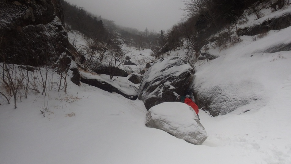・六丈沢への下降点から六丈沢を左にして灌木帯を下っていきます。途中、右の枝沢のほうを歩くところ等ありますが今回は雪道でトレースがあったので右往左往せずにすんなり黄蓮谷まで下れました。