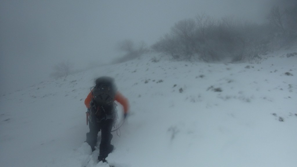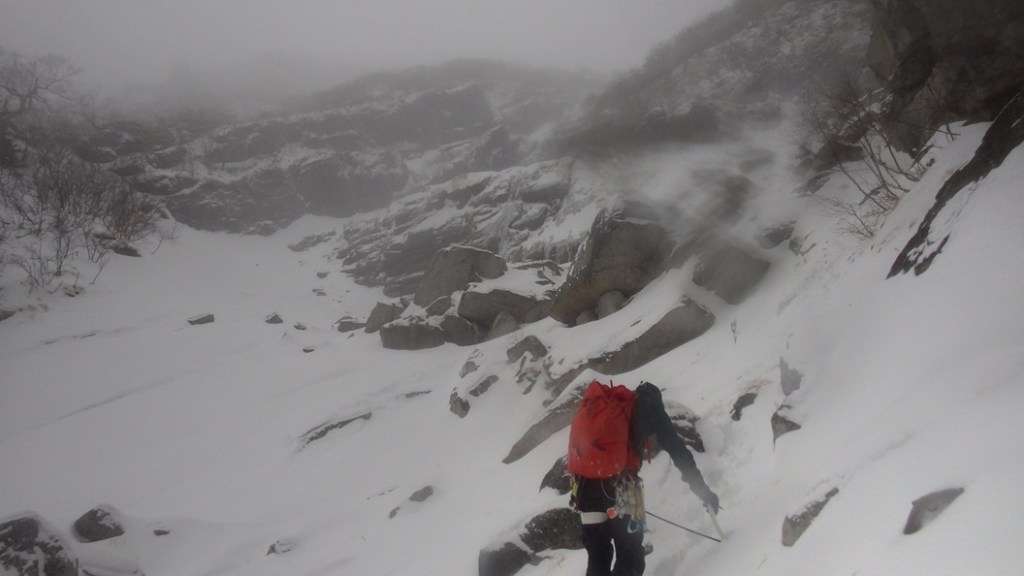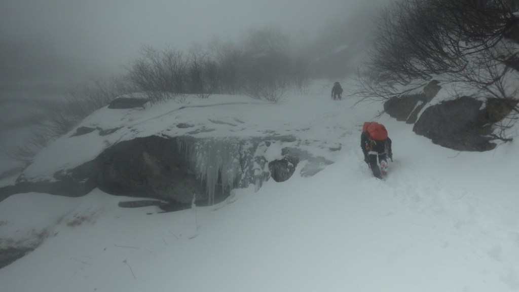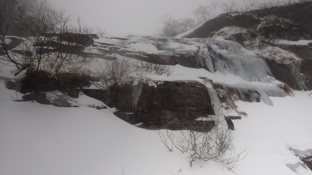 ・坊主の滝を登り始める頃からの雨が降ってきて一時雪に変わった時間も少しありましたが山頂までほぼ雨が降ってました。