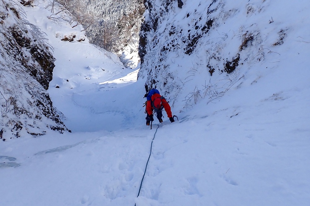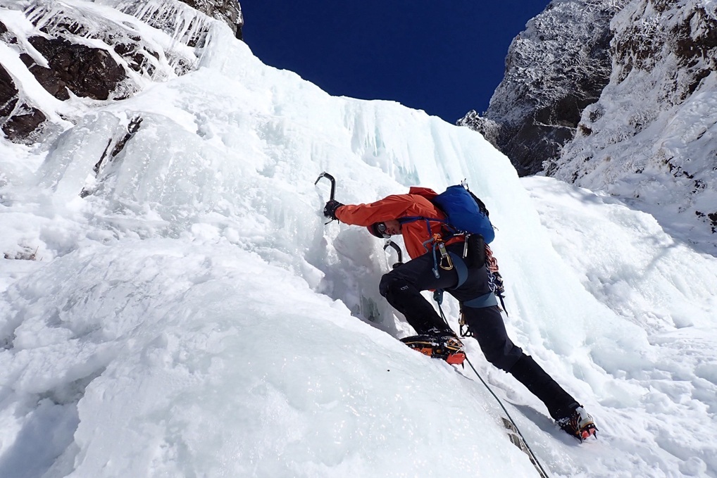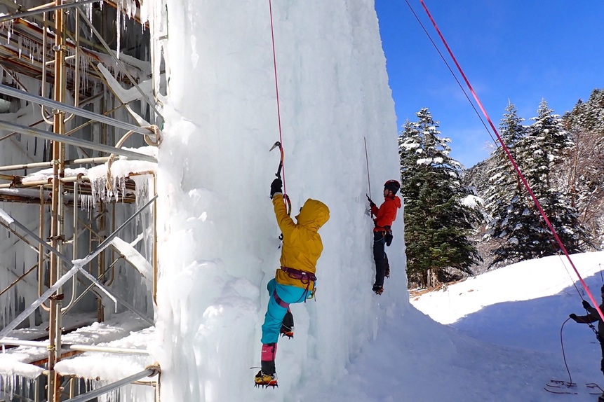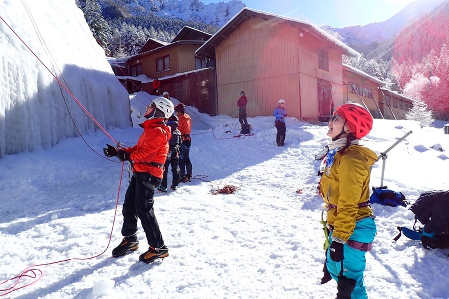(廣澤な)まり子さんに誘っていただき初めて参加させていただきました。冬靴やアイゼン、アックスを初めて使ったのですが、まず重さにびっくりしました!そんなに本数を出していないのに今日は筋肉痛に泣いてます(笑)アイスクライミングはクライミングとはまた別物なのかなぁと思っていたのですが、バランスの取り方や、足の置き方など普段やってるクライミングと通づるところがたくさんあるんだなぁと思いました。アイゼンを引っ掛けないように事前に声掛けしてもらっていたのですが、登っている時に足にかすめてレインが切れました。ちょっとかすめただけだったのですが、家でかすめたところを見たらぶち身になっていました。アックスやアイゼンなど歯があるものを使ったり、氷の破片が飛んできたりするのでと安全管理がきちんとできていないと簡単に重大事故につながってしまうんだろうなと感じました。普段の山行やクライミングでもそうですが、安全管理の重要さを改めて感じました。アイスクライミングは全く経験がなく、道具もレンタルだったのでやや不安な気持ちを抱えつつの参加でしたが、進藤ご夫妻はじめ、諸先輩方に丁寧に教えていただいたり、手厚いサポートをしていただいたりし楽しいアイスクライミング体験となりました!初山小屋泊も最高でした!!夕食がステーキではないと知り最初はしょんぼりしましたが、魚や鍋がとっても美味しくて魚派になりました!たかさんのホットワインやまり子さんのおいなりさんとっても美味しかったです。ごちそうさまでした!久しぶりの山で皆さんをお待たせする場面が多々あり申し訳ありませんでした。本当にお世話になりました。ありがとうございました。