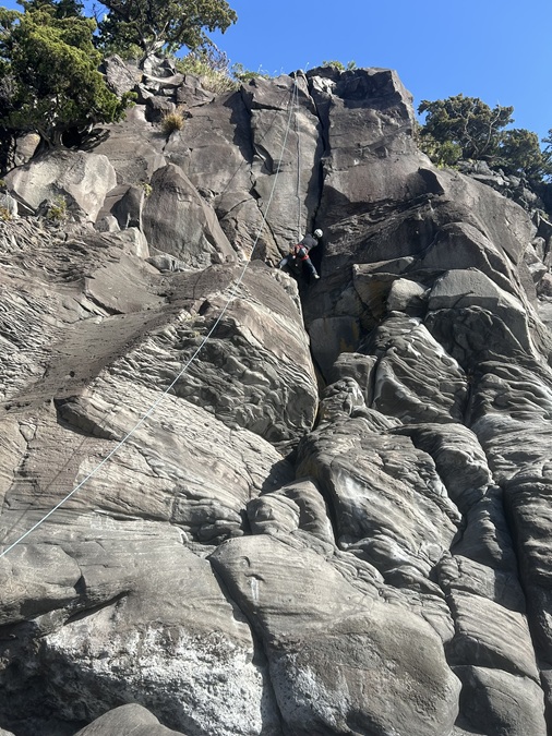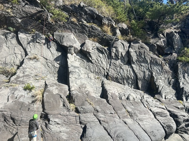 (竹内)城ヶ崎は、I日目シーサイド、2日目オーシャン、3日目、日蓮崎と天候に恵まれ、疲れましたが楽しいクライミングになりました。私は、I日目、ピーターパン【10b】 、フック船長【10b】をリードで何とかトップアウトできました。ピーターパンは、中間の一手が越えられなくガックリ、しかし右手カウンターから左に変えたら突破、ムーブは大事。フック船長は、佐藤ゆ氏の、ヌンがあり気力で何とか越えました。クラッククライミングは撃沈。トップロープ張ってくれた佐藤ゆ氏に感謝。まだまだ修行が足りません。又、かの有名な、浮山橋やアストロドームも見学できました。体の続く限り挑戦したいです。