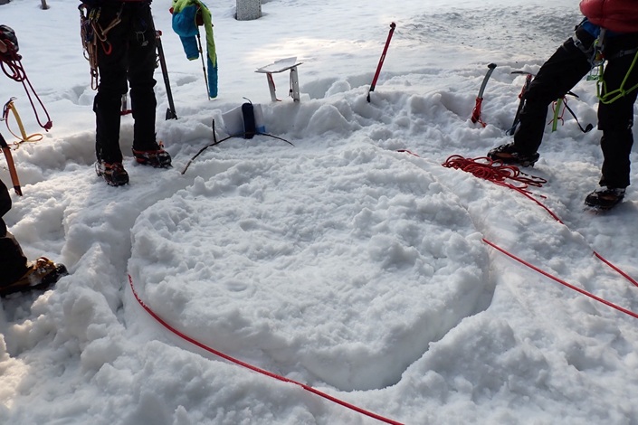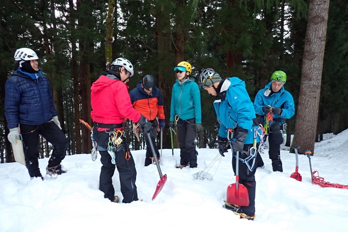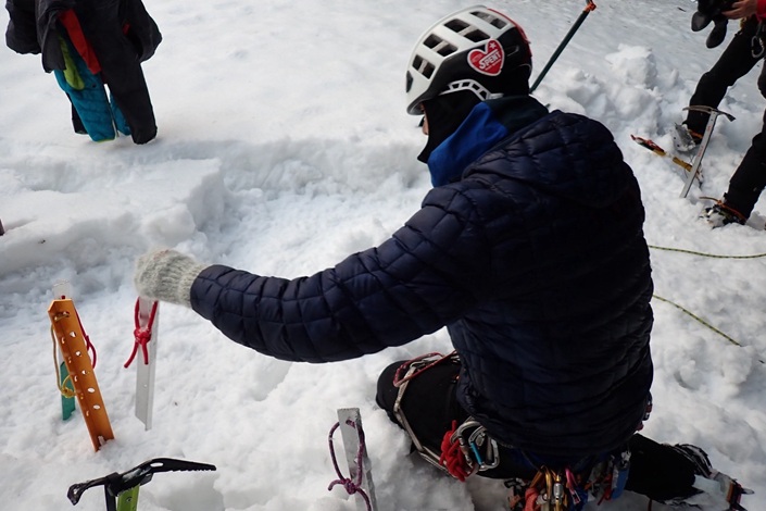 ・雪上での支点構築(スノーバー縦刺し・横埋め、アックス横埋め)