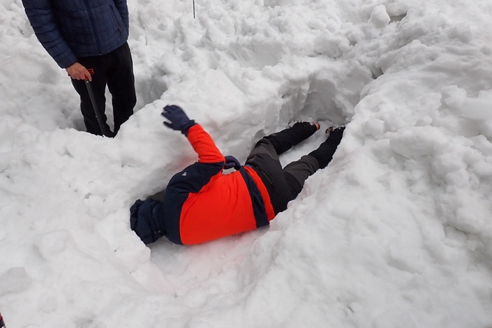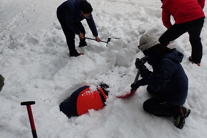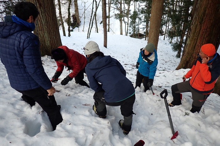 (久保田)今回の訓練は、「やりたかったこと」「やっておくべきこと」を幅広く体験できる貴重な機会となりました。支点設営では、土のうの有効性やボラードの構築などを実際に試せたことが大きな収穫です。楽しみにしていたイグルー作りは、雪質の影響で叶わず残念でしたが、代わりに大きな雪洞で一晩を過ごしたことは、非常に良い経験になりました。また、初めて実戦形式で使用したビーコンやプロービングでは、その難しさを痛感しました。定期的な練習が必要だと感じています。雪に埋められたのも良い経験になりました。