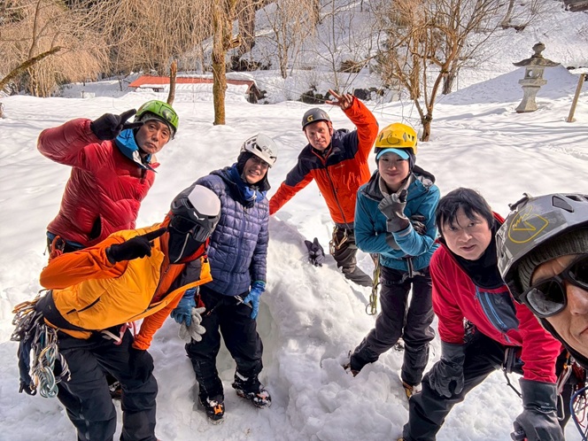 (永井)今回自身初となる雪上訓練に2日間参加させていただきました。雪山でのアックス スノーバー デッドマンを使用しての支点の構築やスタンディングアックスビレイを実際に斜面で行ってみました。上記の道具を使用しての支点構築はその場の条件や雪質等で角度や深さ、荷重の方向等を良く考え設置する事。スタンディングアックスビレイはある程度ロープを流した方がビレイヤーにかかる衝撃が少なく安全性が向上する事。懸垂下降を行う場合、土のうやスノーボラード等の構築が雪山では有効である事。土のうやボラードの構築は実際やってみて活用の有効性を確認しました。バチぎぎでとても安心感がありました。これもやはりその場の条件や雪質で深さや大きさに留意が必要と感じました。今回の楽しみの1つでしたイグルーの製作は残念ながら雪質が悪く失敗に終わりました(笑)標高の低い二王子神社周りであったためイグルー上部の細長状のブロックが上手く作れませんでした。そのかわり神社屋根から落ちた雪の山に雪洞を掘り5人の寝床をつくりました。疲れましたが製作から泊まりも含めとても楽しかったです。1日目の後半と2日目にビーコンを使用しての遭難者の捜索や救助方法について学びました。初めてビーコンを使用させていただきましたがその性能の高さに驚きました。難しかったのはプローピングですね……今回は会長のビーコンを袋に入れ雪に埋めて行ったのですが対象物が小さいので上手くいかず訓練とはいえ2名の遭難者をタイムアップのため救うことができませんでした。(笑)プローピングは中心と決めた位置から一定の間隔で渦巻き状に捜索する事が実践的であると学びました。長くなりましたが大変貴重な経験をさせていただきました。会長を初めメンバーの皆様ありがとうございました!