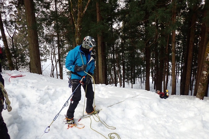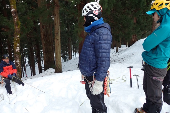 (中村)今回初めて参加させて頂きました。雪上でのスノーバー、デッドマン、ピッケルを使っての支点の構築と、その時のセルフビレイの方法、スタンディングアックスビレイでの立ち位置やロープの送り方、土のうやスノーボラードでの下降方法やセカンドビレイの方法と盛り沢山!教えて頂きありがとうございました、とても勉強に成りました。これからの山行に使える様にしたいと思います。