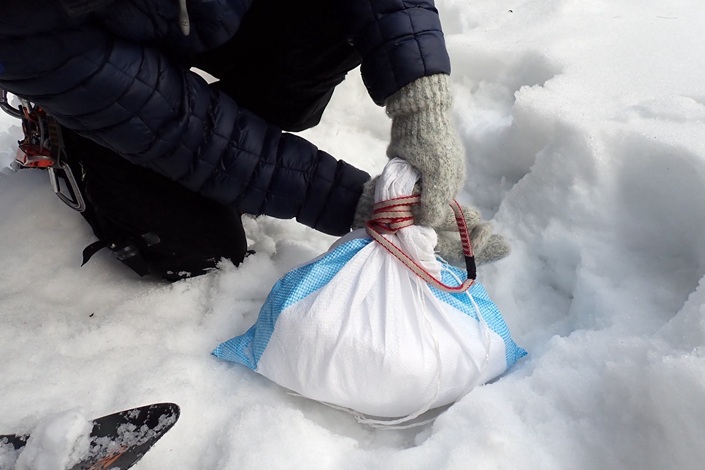 (加藤)雪上での支点の作成や、ビレイの仕方など、雪上での訓練とロープワークは初見で勉強になりました。スノーバーの横埋め込みだけで、雪面にきき、びくともしないことには驚きでした。土のうやスノーボラートなど様々な下降方法を知ることで、様々な状況下での対応ができ、選択肢が増えることが大切だと感じました。今回は構築した支点で1人が下降して、体重をかけてどの程度の強度かを確認しました。他の山岳会のレポートを訓練後に確認すると、何人の体重をかけると支点が破断するのかを確認しており、次回は強固な支点で、どの段階で破断するのかの確認もしたいと感じました。参考に土のう袋は、3人で全体重をかけると破断。左右への引張りが激しいと崩壊が加速するらしいです。訓練ありがとうございました。
