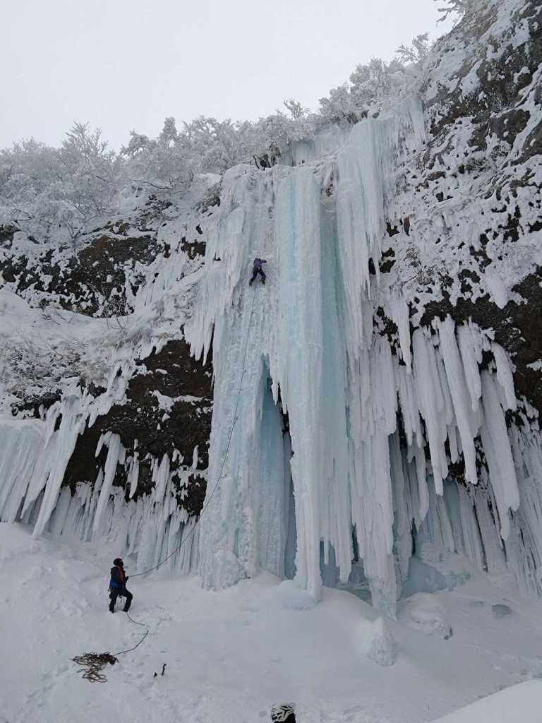 (木村)急遽、進藤さんパーティーに同行させていただきました。好天予報のため混雑を予想していましたが、始発便に乗ったクライマーは我々のみ。その後も宮城の知人パーティー(2名)が来ただけで、終始ゆったりと楽しむことができました。個人的には2年ぶりに大氷柱のリードに挑戦。中間部まではノーテンションで進めたものの、後半で力尽き、アックステンションを交えながらの「各駅停車」でなんとかトップアウト。長時間のビレイをこなしてくれた荒木君には感謝しかありません。その後はミニ氷柱や糸滝を巡り、最後にもう一度大氷柱を回収便で登って締めました。近年、氷瀑見学ツアーの賑わいには驚かされますが、逆にクライマーの数は減っているように感じます(空いているのは助かりますが……)。しっかり登り込めて、非常に充実した一日となりました。