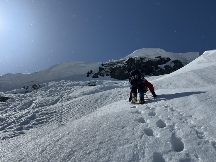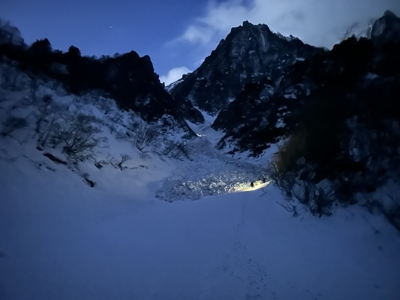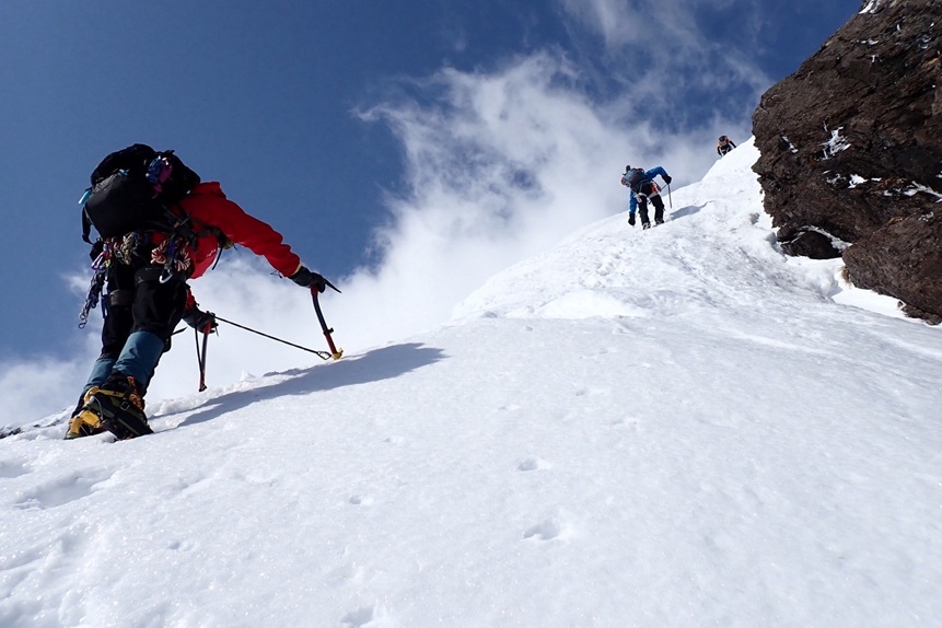(土田た)今年も皆さんのサポートのおかげで東尾根無事完登でき嬉しかったです。今回の東尾根は去年とはまるで違う装いでした。ダイナミックなトラバース祭りを歩けて充実度が高ったです。雪山は行く年行く時期で違う表情を見せてくれるのが好きな理由かもしれません。個人的な反省点を上げると第一岩峰でてこずったことです。ちゃんと手があったかもしれませんが、アックス一本を信じて体を上げるのが怖かったです。まだまだです。練習頑張ります。またリードチャンスもありましたが頭の中でしばらく逡巡の末、木村さんにお願いしました。自分に自信が持てる技術がないのでメンタルも追いついてないと思いました。最後に久保田さんと中村さんの頑張りに感動しました!