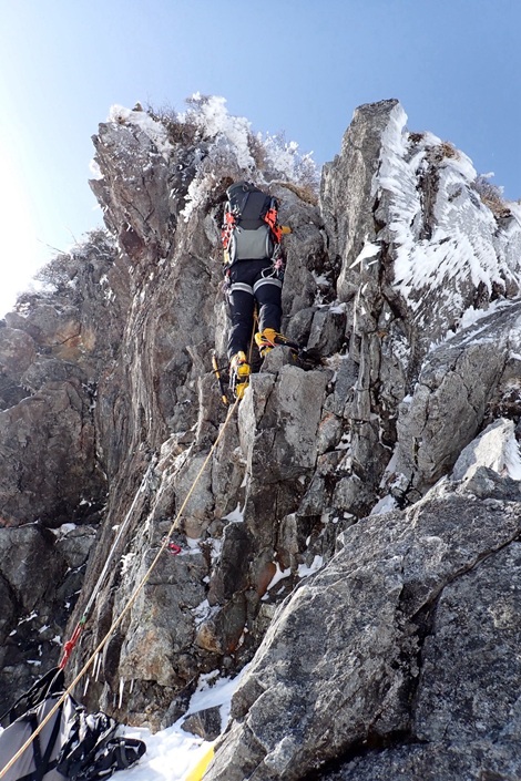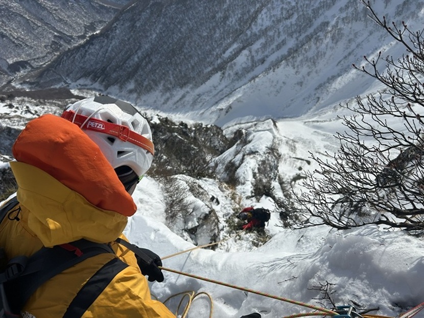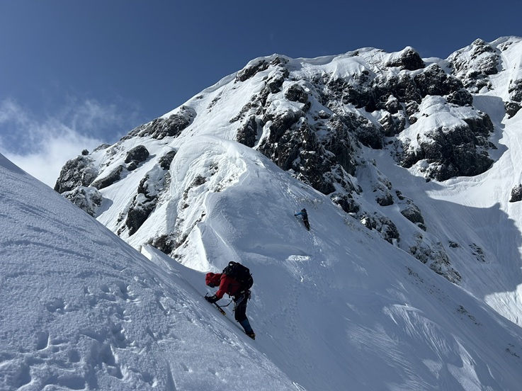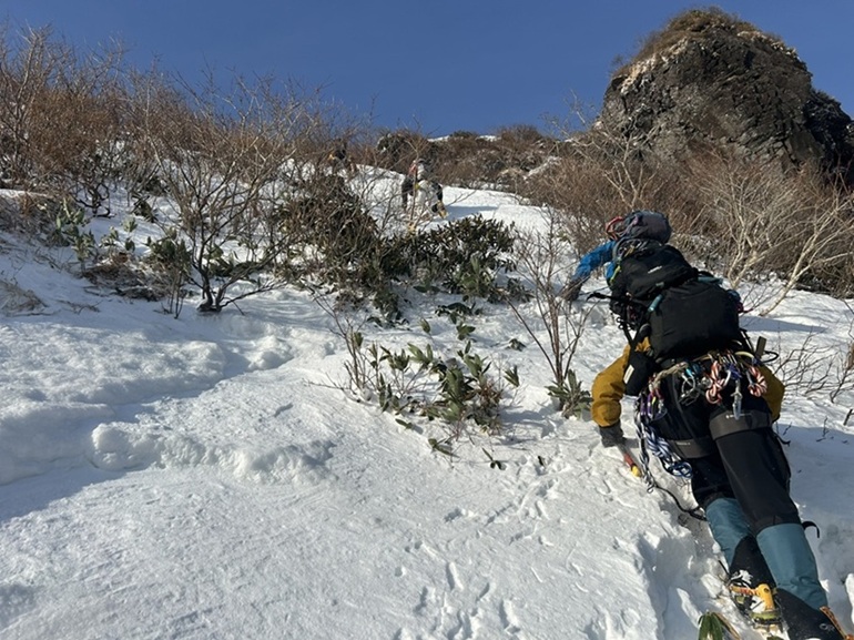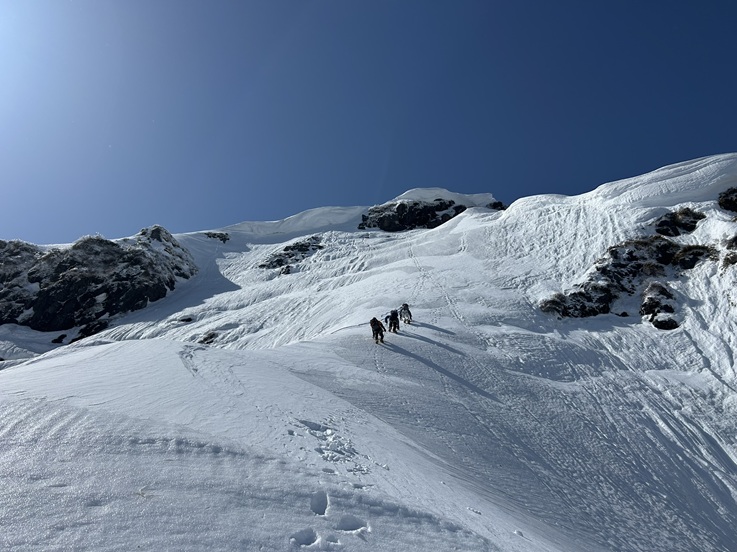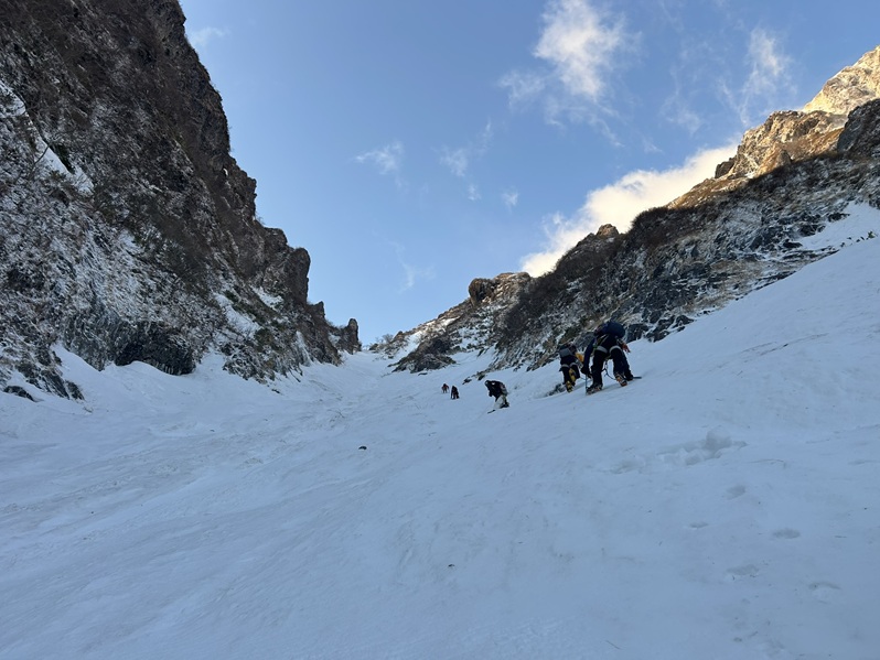 (木村)昨年に続く挑戦となりましたが、「あの唯一無二の経験をもう一度味わいたい」という強い思いから、今年も東尾根の列に加わりました。天候判断により1日スライドしての出発。当日は強風に見舞われたものの、終始晴天に恵まれ、絶好の登攀日和となりました。一ノ倉沢の急峻な登り、緊張感漂う雪壁のトラバース、そして核心部である第一岩壁の登攀と、東尾根の持つ魅力を余すところなく堪能することができました。今シーズンは昨年よりも積雪が少なく、随所で岩が露出したミックスクライミングの様相を呈していました。第一岩壁ではリードを担当しましたが、取付きでアックスが抜けて尻もちをつくというヒヤリとする場面も。しかし、即座にフリー(手登り)へ切り替える判断で、なんとか突破することができました。最終的にメンバー構成に変更はありましたが、参加した全員の足並みが揃い、計画通り無事に下山。NCCの「登竜門」として、また伝統ある恒例山行として、これからもこの素晴らしいルートが引き継がれていくことを切に願っています。