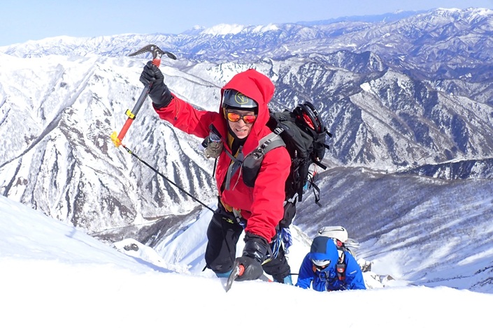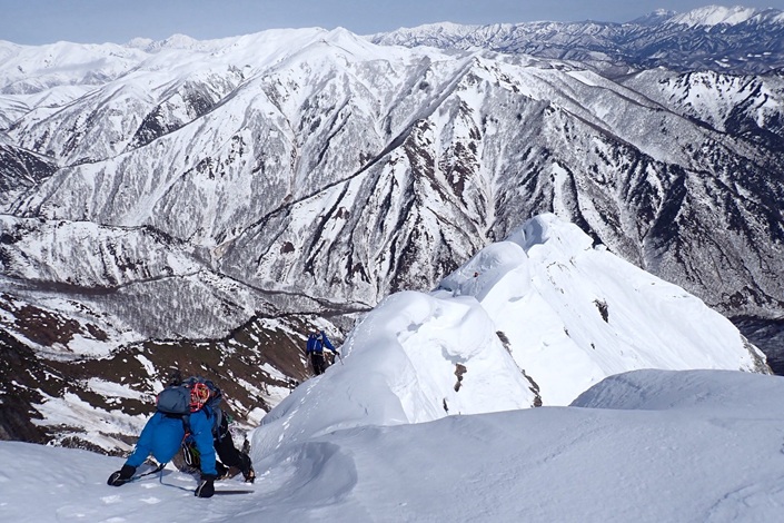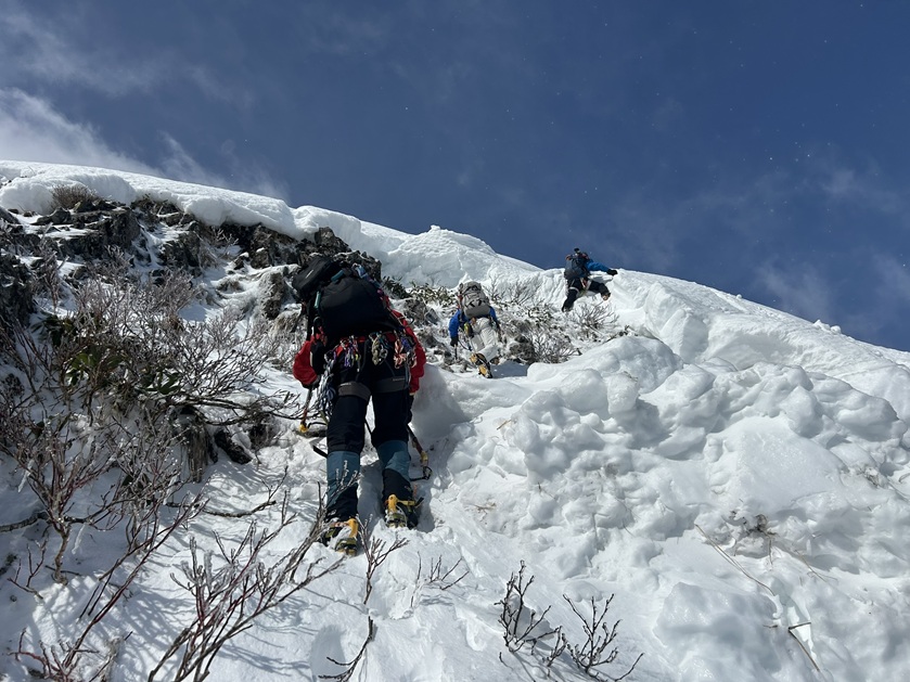 (久保田)雪山での本格的なバリエーションルートは今回が初めてでした。谷川岳東尾根について事前に調べようと思ったが情報が少なく、それがこのルートの厳しさを物語っているように感じました。実際の登山はキツイ登りと急斜面のトラバースの連続で、危険な場所ではロープを出していただき、必死で登りました。天気予報に反してガスはなく天気も良くなりましたが、終始風速10mを超える風が吹いていたため、汗をかいて体温を奪われないよう心掛けました。なかなか見えてこない山頂に心が折れそうになりましたが、山宮さんに「あれが山頂だよ」と言われたときは胸がいっぱいになり、登っている仲間の姿に見入ってしまいました。最後の急登はトレースをしっかりたどり、山頂で貴さんに「おめでとう」と言ってもらったのが嬉しかったです。今回の登山は一瞬も手を抜くことができず、緊張の連続でした。急斜面でのトラバースや岩場では、これまで1年半続けてきたアイスやクライミングの経験が役立ったと思います。足の使い方など反省点も多いですが、自分の限界を知ることができ、素晴らしい経験になりました。最初から最後まで助けていただいた皆さん、本当にありがとうございました。下山の西黒尾根では脚が限界を超え大変でしたが、この経験を糧に、また次なる目標に向けて練習していきたいと思います。