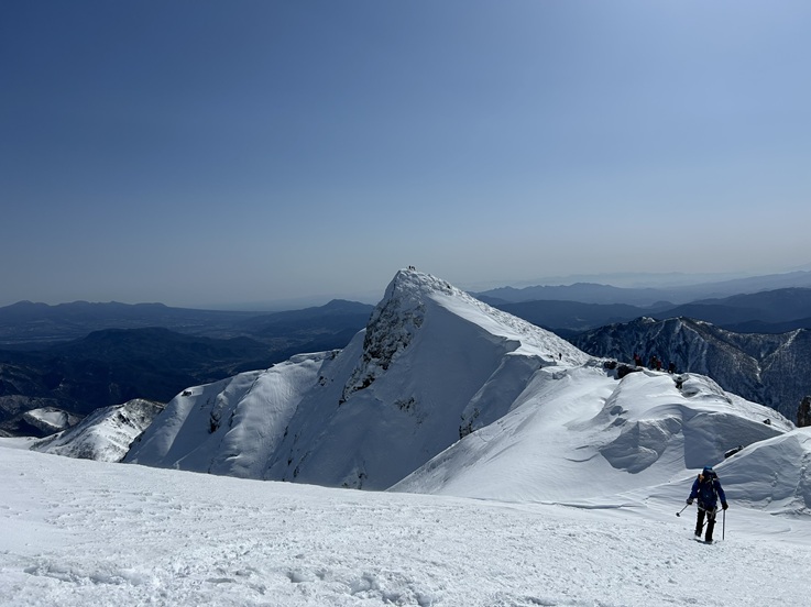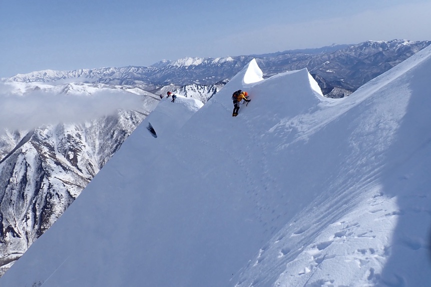 (山宮)当初2/28(土)に予定していた東尾根ですが天気予報が悪かったので3/1(日)に変更しました。車で移動中、新潟はずっと雨でしたがトンネルを抜け群馬に出ると雨は上がってました。降雨後の登攀で少し心配していたところもありましたが。雪崩るようなコンディションではなく、風も強いですが体勢を崩すほどではなかったので良かったです。(ダメだったら撤退ですから!!)東尾根は今回で5回目になるので個人的な緊張感は全くありませんでしたが、初めてのメンバーが2人いたのでそのサポートで緊張しました。(おぼつかない足元とかを見ているとね・・・。)第二岩峰での待ち時間があり予定より少し遅くなりましたが、皆さん無事に登頂し下山できて良かったです。