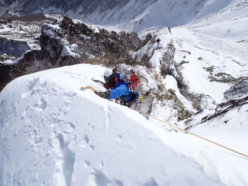 ・第一岩峰を抜けた先の雪道は左は雪庇で真ん中から右半分をトラバースする形で歩きましたがスタンスの雪が柔らかく崩れやすかったので確実にスタンスを決めてからの歩行となりました。