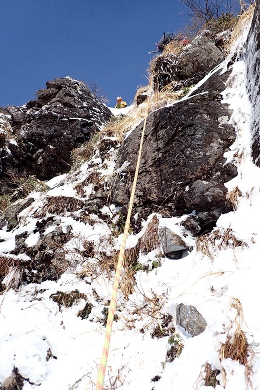 ・第二岩峰はしっかり出てました。ロープを出して登りました。岩登りになりますが締まった草付きにピッケルを打込めるし、熊笹等を掴みながら登れます。
