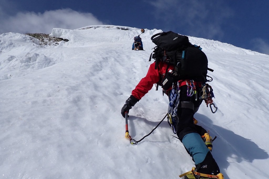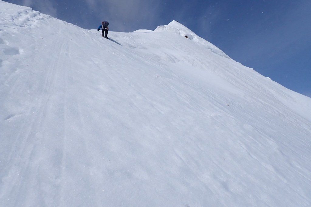 ・山頂直下の雪壁は上面の雪がザラメで柔らかかったのでしっかり蹴り込んで登りました。
