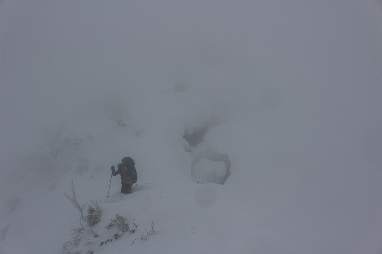 (加藤)未丈ヶ岳~毛猛山はメジャールートですが、今回は前毛猛山、裸山を組み合わせた夢のルートに挑戦でした。前毛猛山手前と裸山先の岩場細尾根が今回計画の難所2ヵ所でした。前毛猛山は尾根どおし、裸山先はトラバースを選択。細尾根の岩場はスタート地点から見えない難所が何ヵ所もあり、難しさを痛感。裸山先の難所は今度はトラバース選択で、尾根上とトラバースの違いを身をもって体感できました。今回は1日目夜中から朝方まで風速24m予報で、どのようにテントを張るのかという課題もありましたが、現地判断で最適場所を探してのブロック作り。どの程度完成までに時間がかかるのかもわかり、次回以降の参考データが得られました。また2日目の半日ガスの中での歩行など、強風を含め、天候悪化のときに泊まったことがなかったため、いい経験になりました。六十里から裸山~国道までのレポはHP上でも記録がありませんでしたが、行程を全て完登できたときの達成感はひとしおでした。